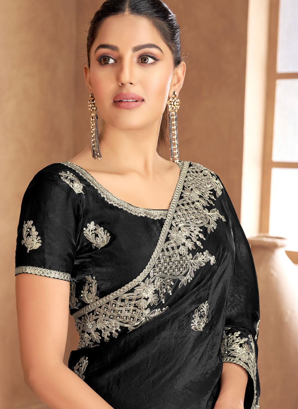 The Satin Black Embroidered Sequins Work Trendy Saree features luxurious satin, intricate embroidery, and sparkling sequins. Its sleek black color makes it perfect for evening events and special occasions. The saree comes with a matching blouse piece for a custom fit.