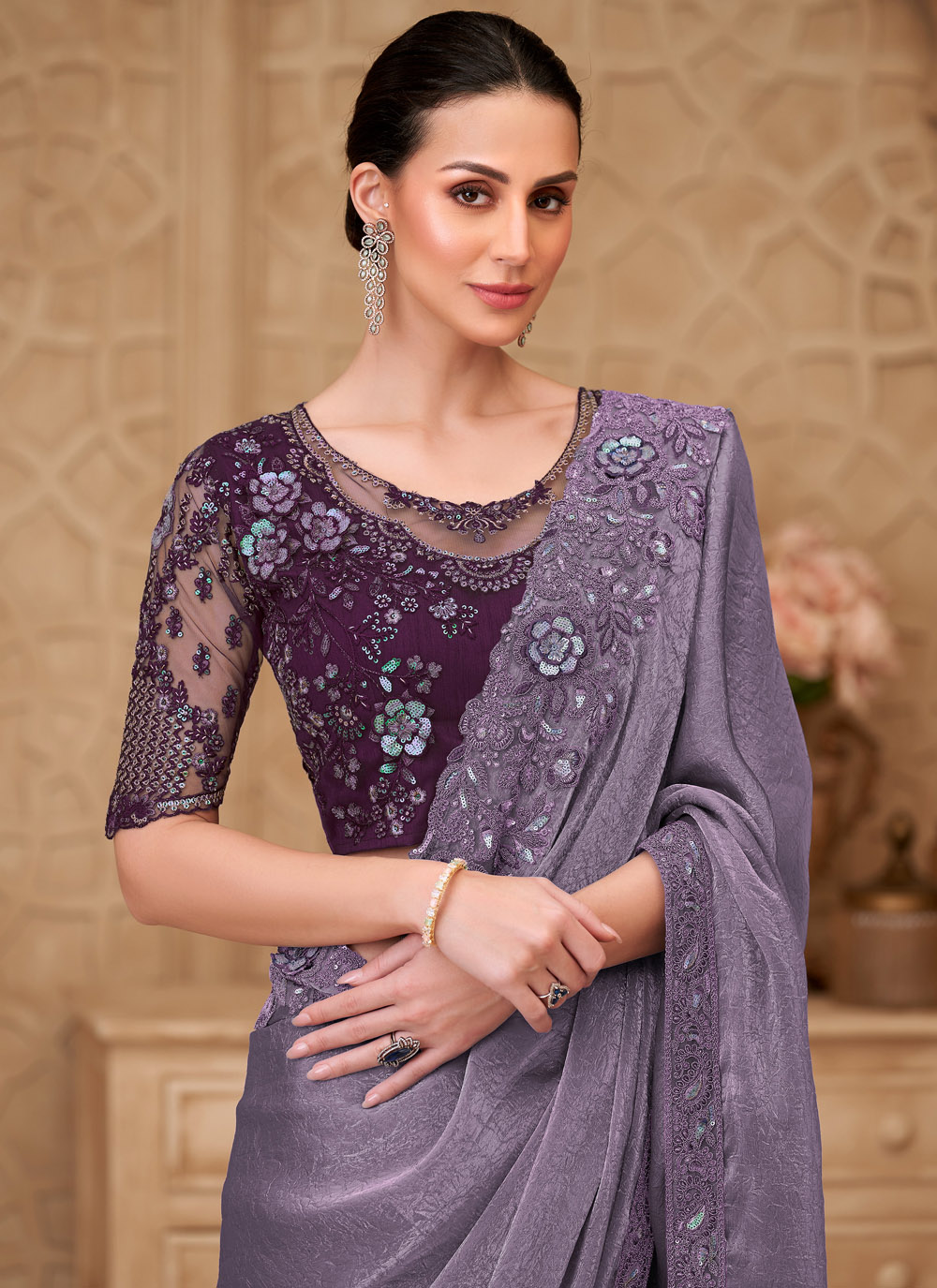 The Satin Georgette Embroidered Lavender Contemporary Saree offers a perfect mix of elegance and modern style. Made from high-quality satin georgette fabric, it provides a lightweight feel and a flattering drape. Comes with matching blouse.