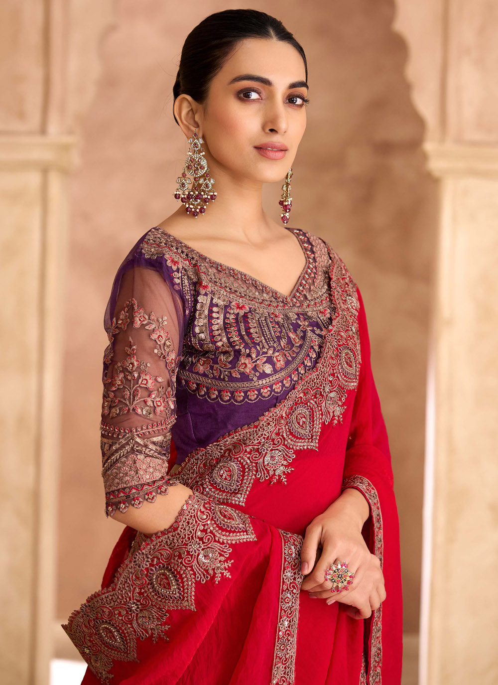 This Red Satin Georgette Saree with Embroidered Border is designed for women who appreciate heritage styles with modern comfort. The lightweight fabric ensures ease of movement, while the embroidered border adds a touch of richness. Comes with matching blouse.