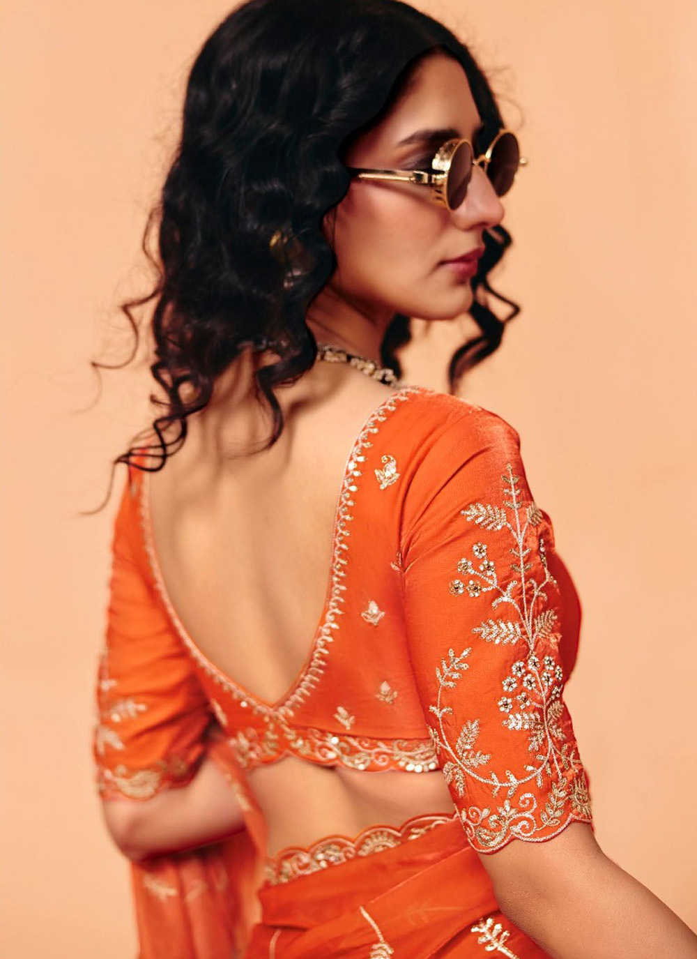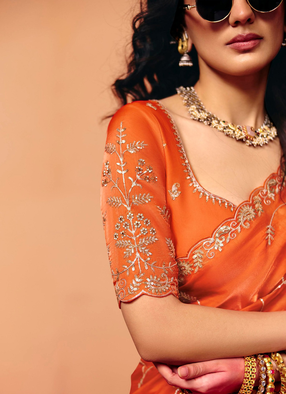 This Satin Organza Sequins Embroidered Classic Saree in Orange Colour showcases a harmonious blend of traditional craftsmanship and contemporary style. The airy satin organza fabric flows beautifully, while the shimmering sequins embroidery adds subtle glamour. Comes with matching blouse.