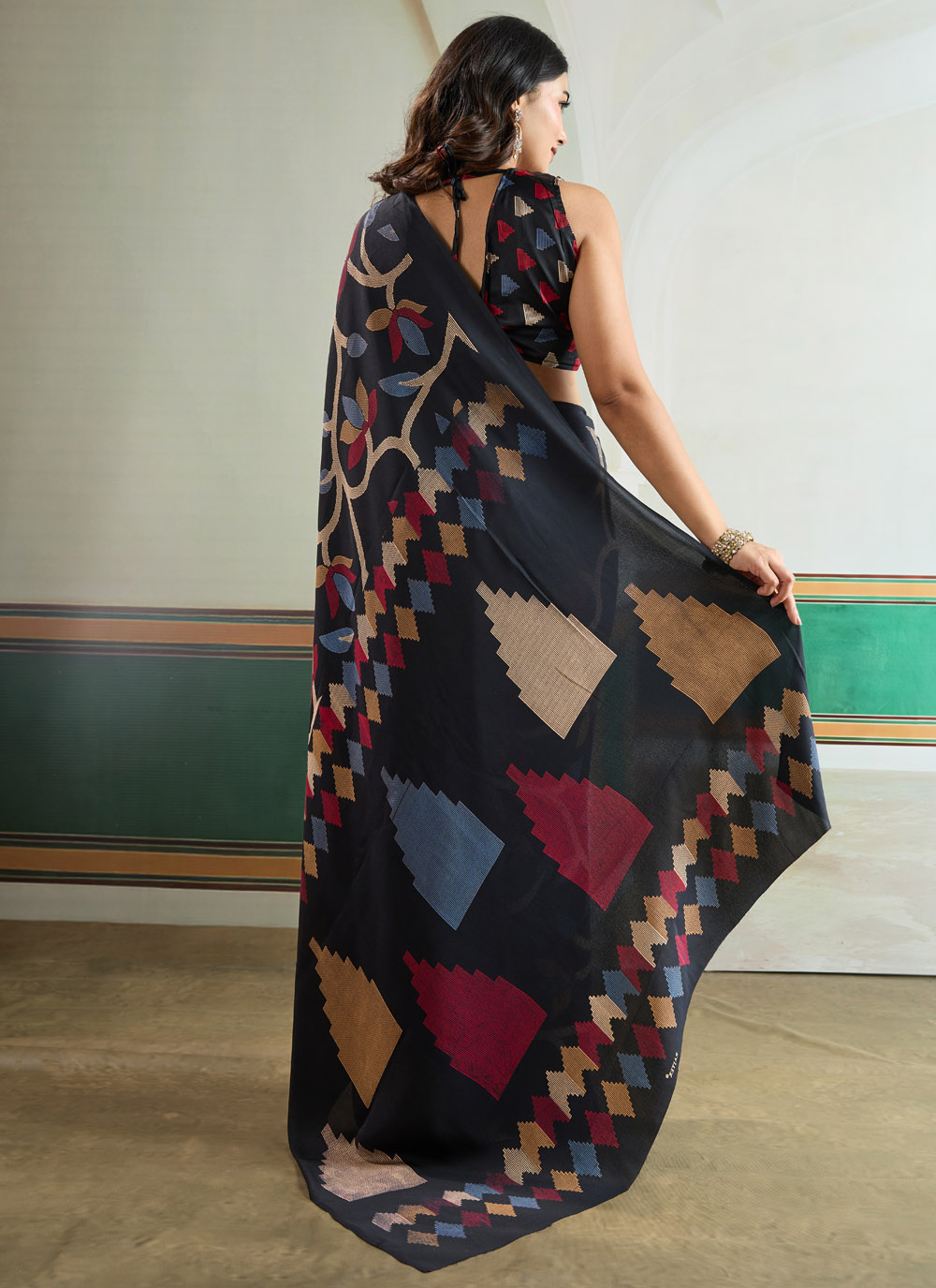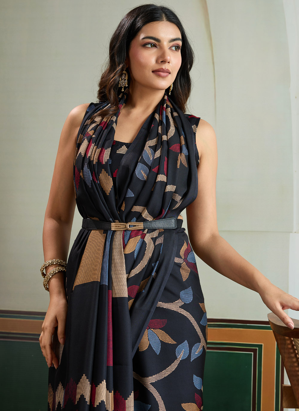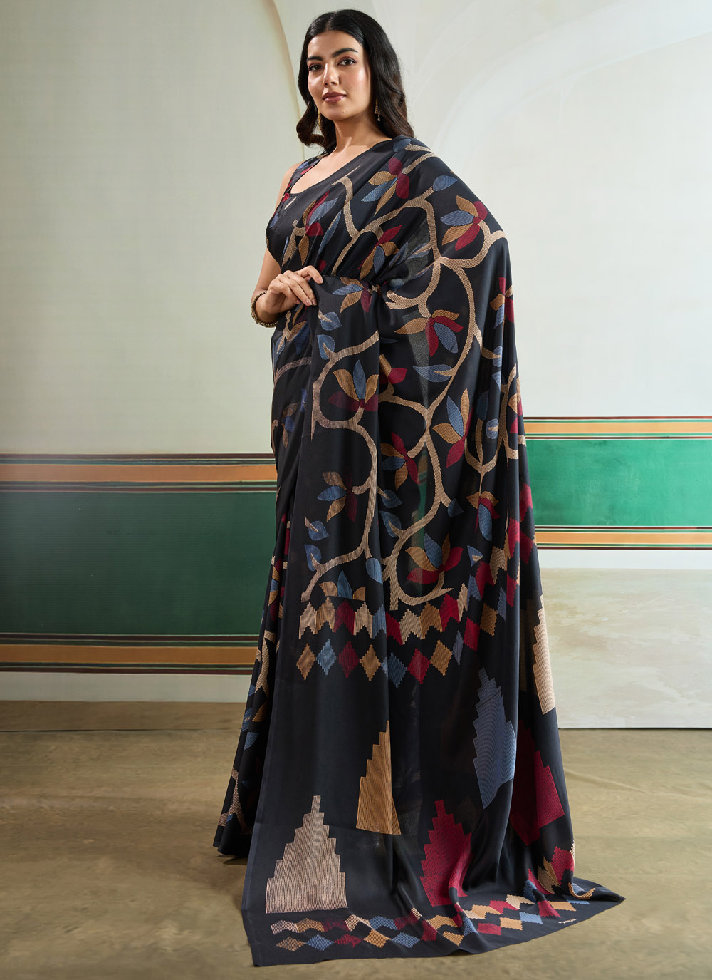 Designed for modern fashion lovers, this printed black satin saree delivers a sleek and graceful appearance. Its subtle shine and fluid texture enhance its trendy appeal. Comes with matching blouse.