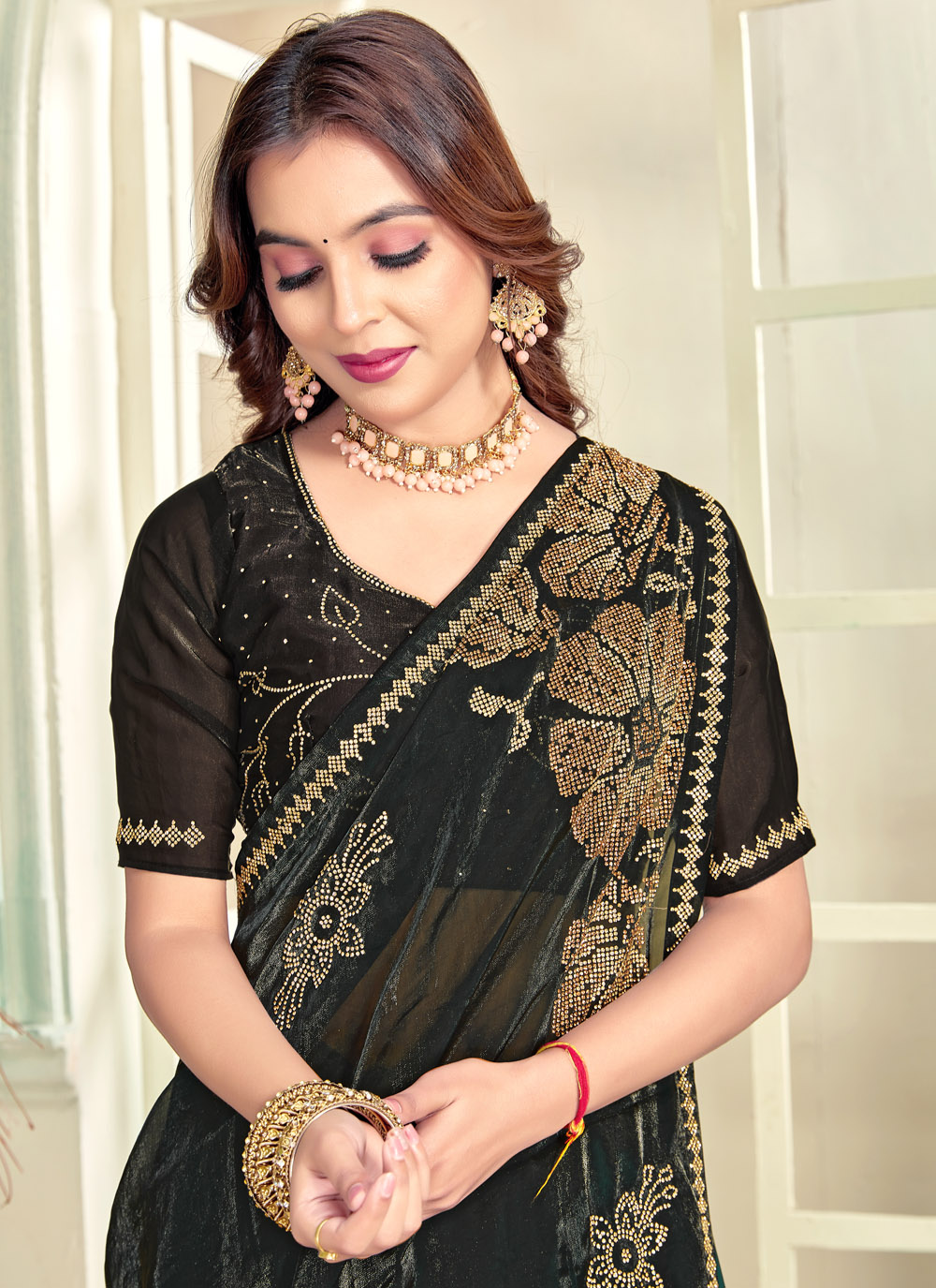 This green satin silk saree showcases a balanced mix of classic elegance and shimmering Zarkan artistry. The glossy satin silk fabric enhances the rich green tone. Comes with matching blouse.