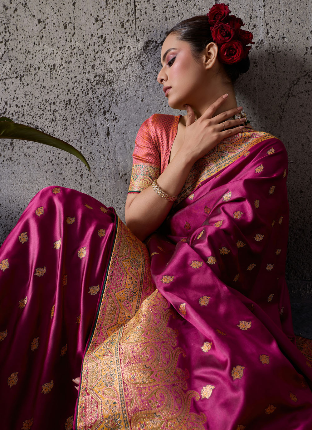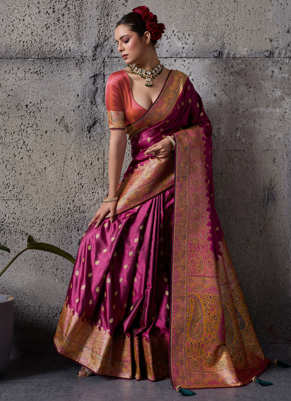 Make a striking ethnic statement with this rani colour meenakari zari woven satin silk saree. The vibrant shade combined with traditional weaving creates a rich and captivating look. Comes with matching blouse.