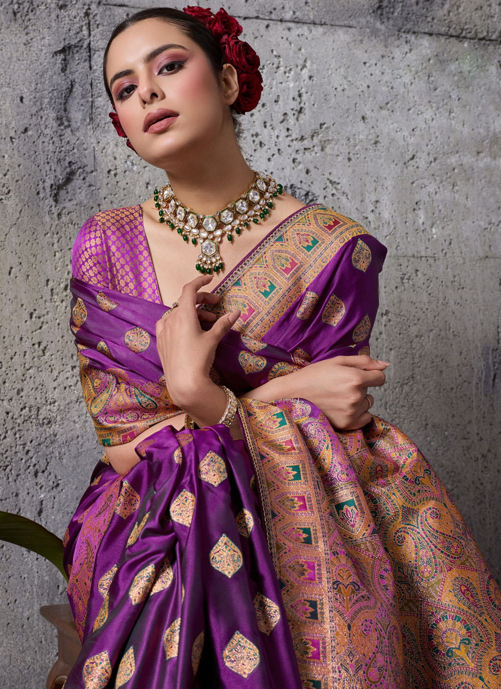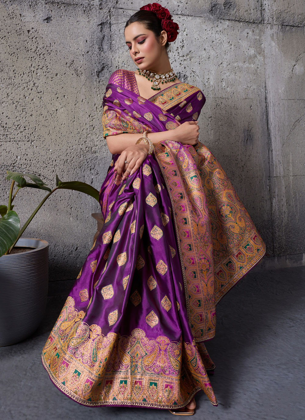 Reveal timeless cultural elegance with this purple satin silk traditional saree, adorned with detailed meenakari zari weaving. The satin silk fabric offers a sleek and radiant surface, while the multicolor meenakari woven motifs enhance its artistic beauty. Comes with matching blouse.