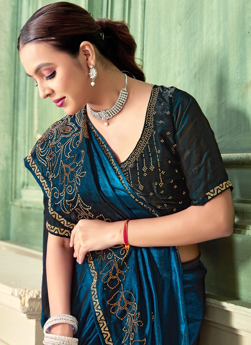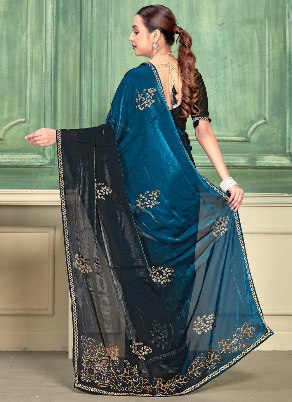 Elevate your ethnic charm with this satin silk teal saree, beautifully detailed with zarkan handwork and a refined designer border. The glossy satin fabric flows gracefully, enhancing your look for weddings, receptions or festive events. Comes with matching blouse.