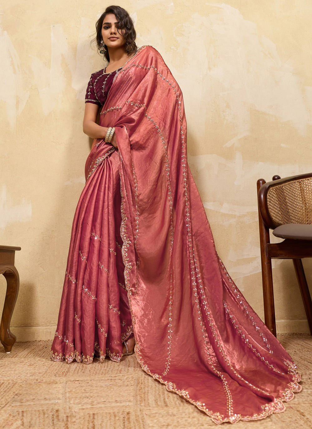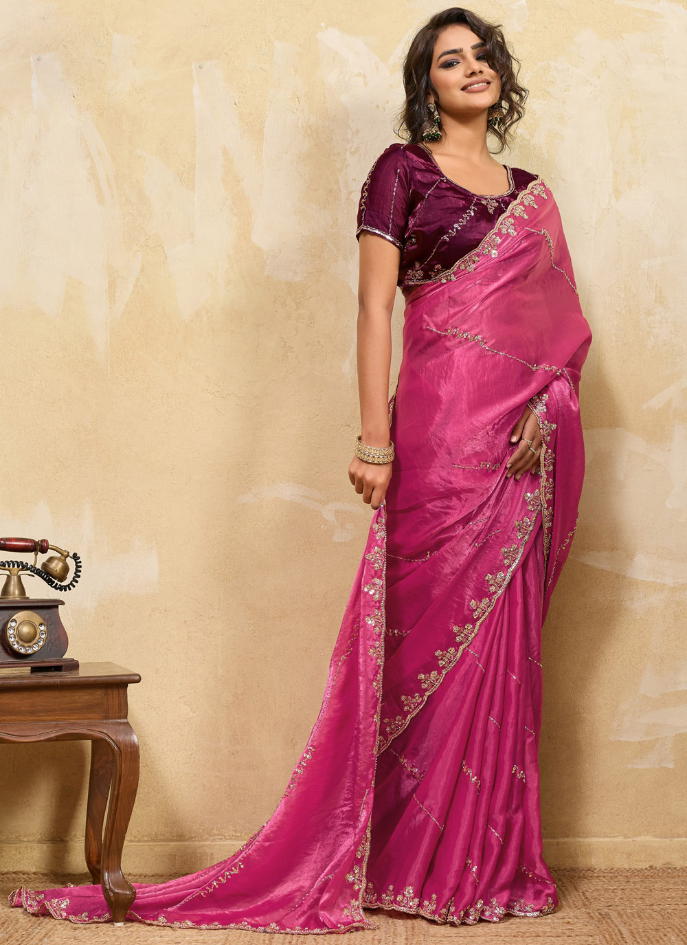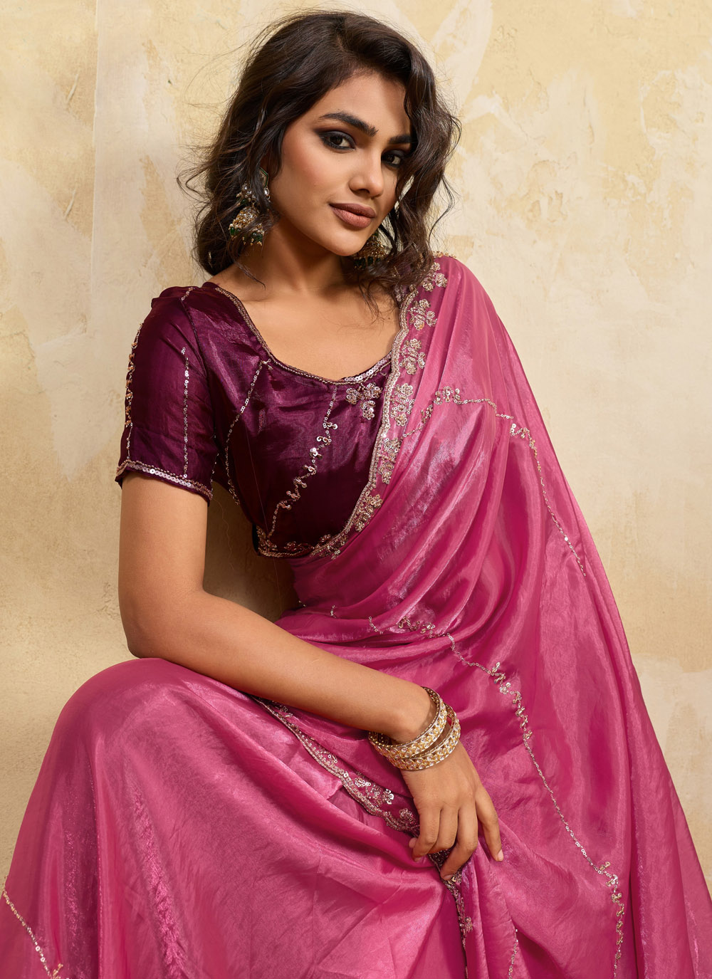 Elevate your ethnic style with this pink satin velvet saree featuring elegant sequins and zari embroidery. The premium fabric provides a smooth texture and luxurious feel, while the detailed embellishments add a glamorous finish. Comes with matching blouse.