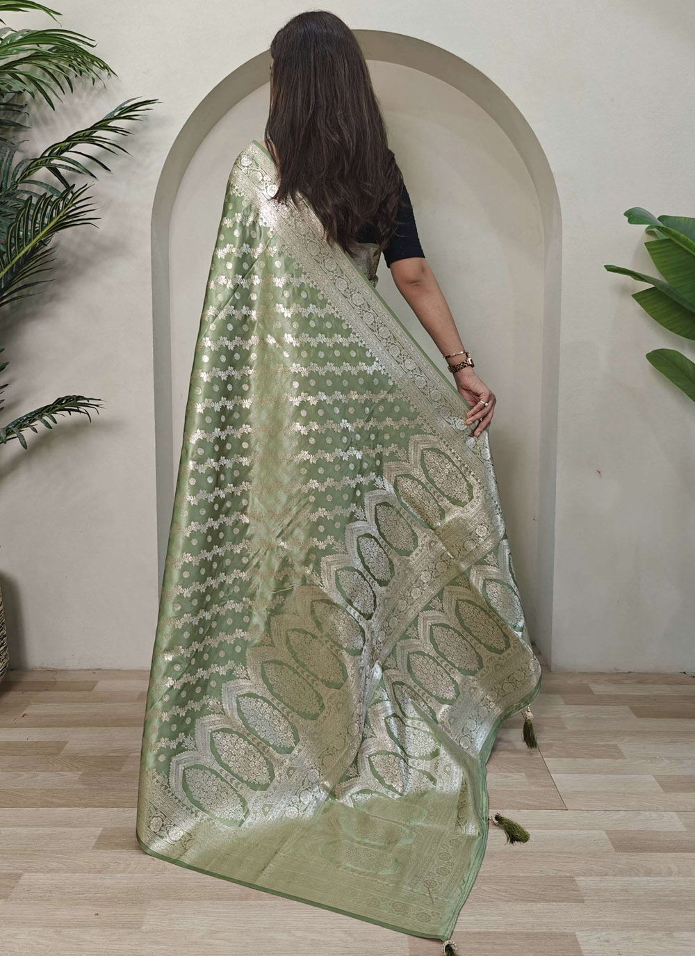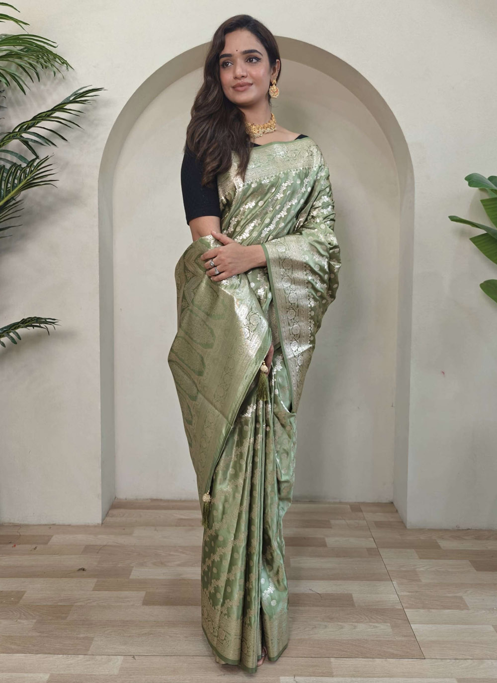 This green satin saree features intricate zari weaving work that captures the essence of ceremonial elegance. With its glossy texture and modern flair, it's perfect for weddings, festive events and grand celebrations. Comes with matching blouse.