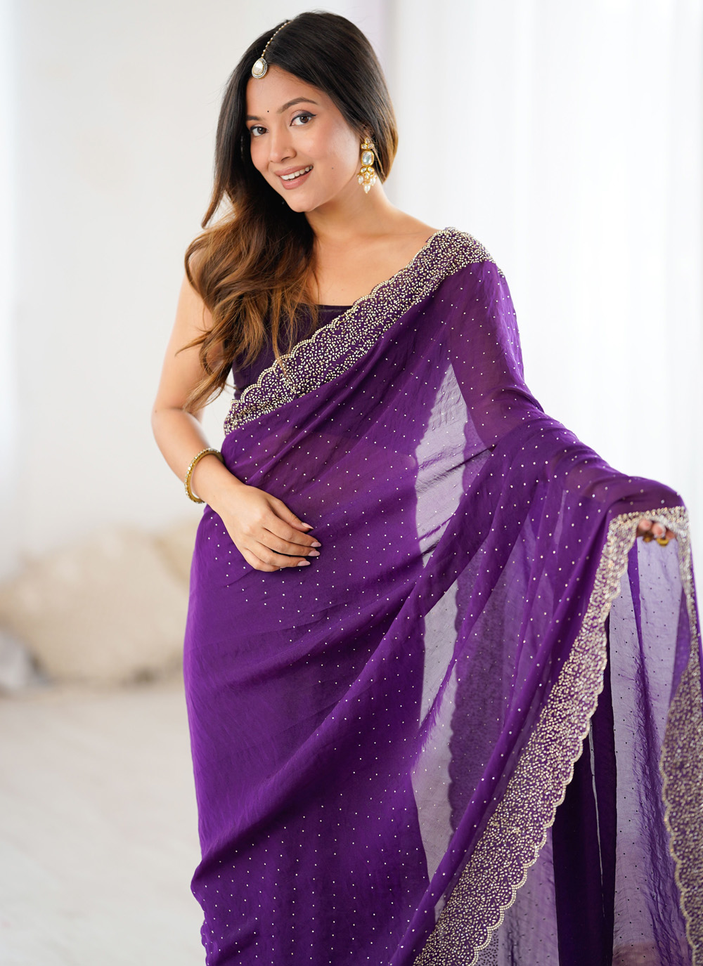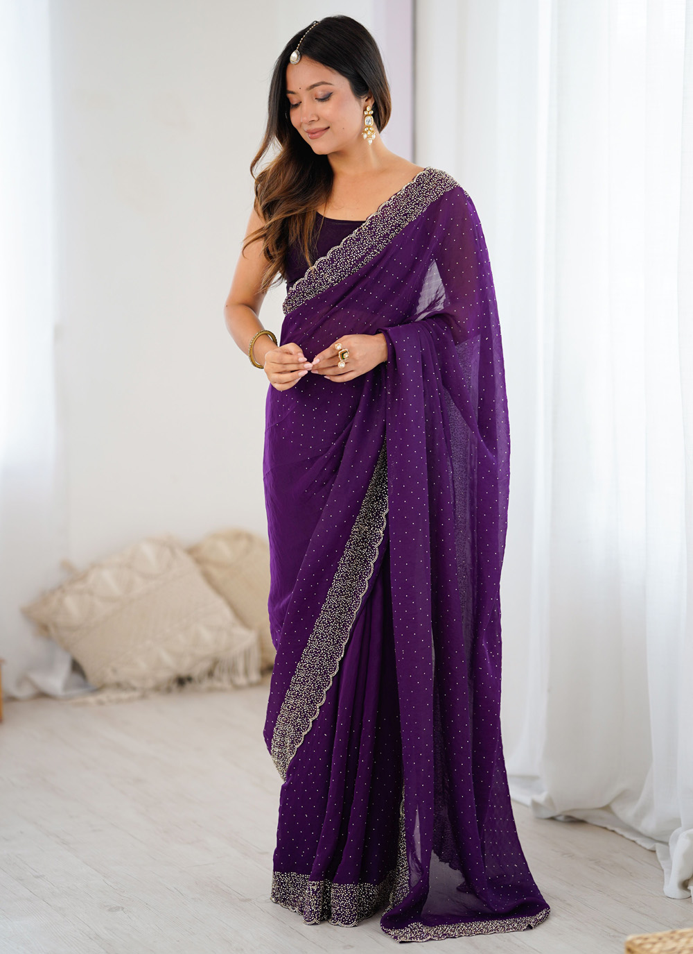 This purple satin saree brings a graceful blend of shimmer and elegance, crafted with delicate hand-done zarkan work that stands out beautifully at festive gatherings. Comes with matching blouse.