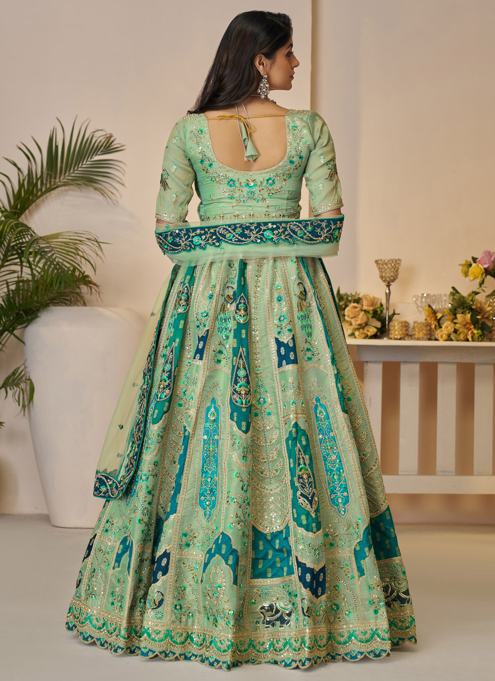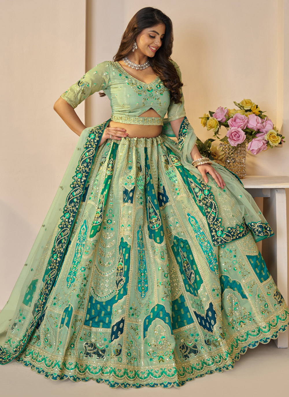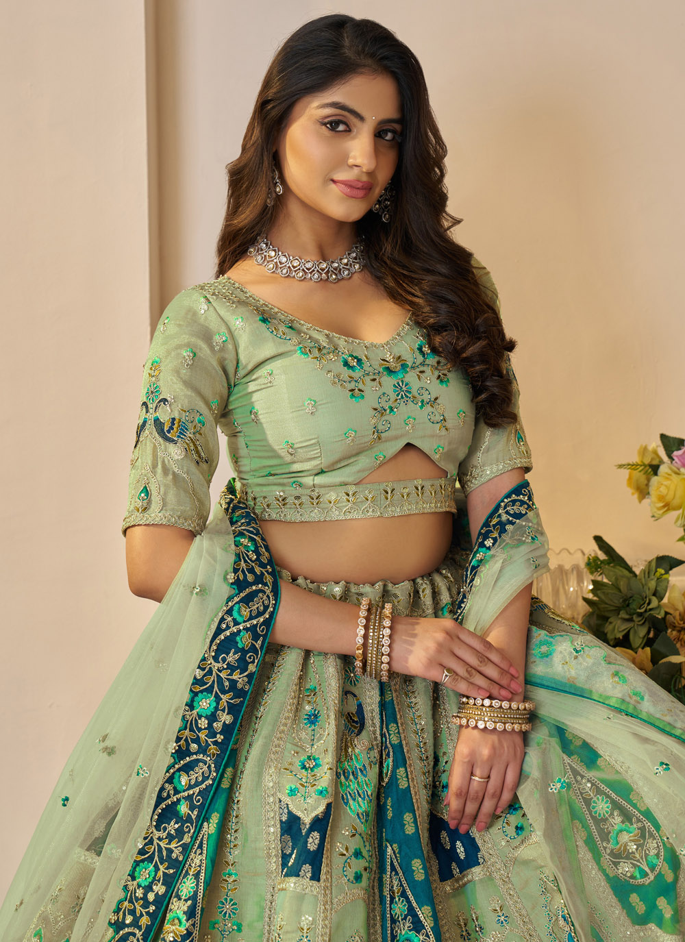 Step into timeless elegance with this sea green Banarasi silk lehenga choli, intricately adorned with sparkling sequins, shimmering stones, zari craftsmanship, and detailed thread embroidery. ideal for weddings, sangeets, or engagement celebrations. Comes with matching choli and dupatta.