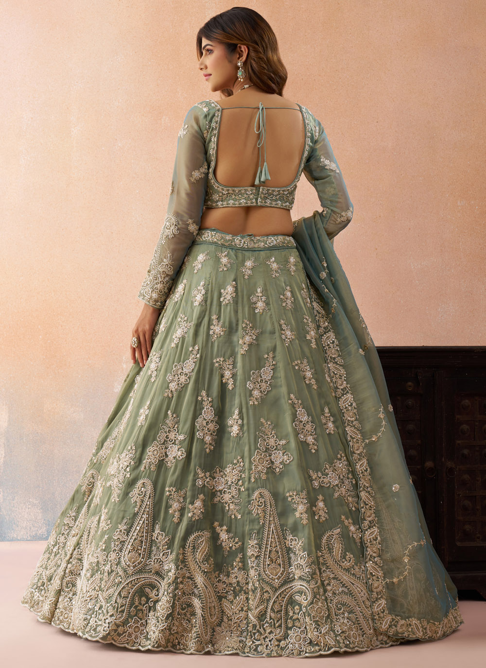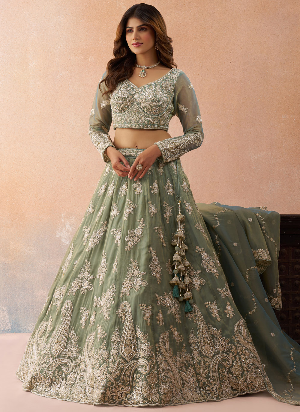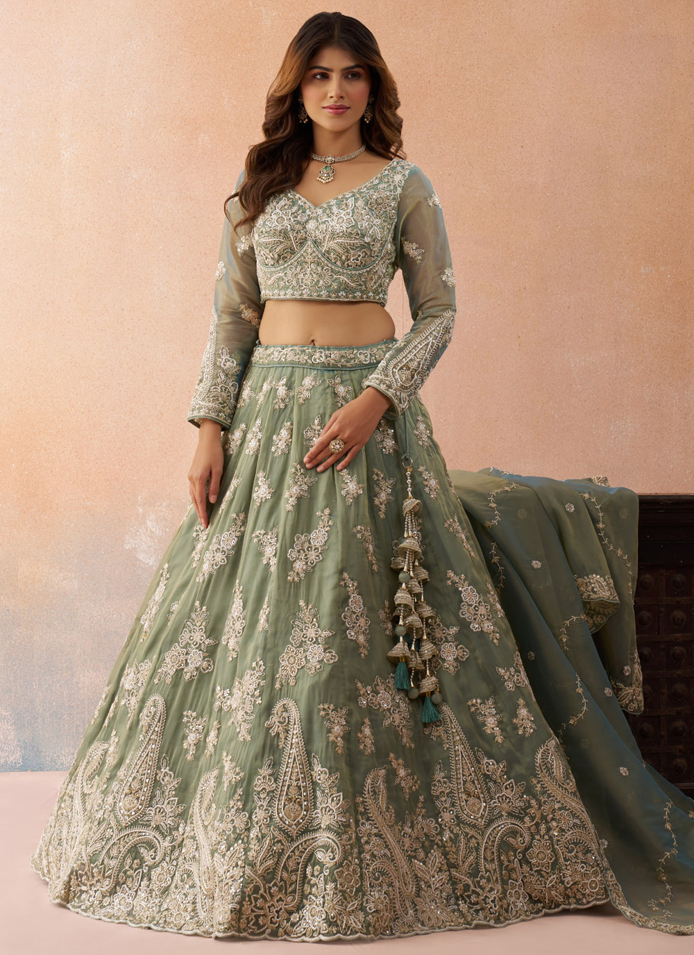 The Sea Green Beads Sequins Embroidered Tissue Lehenga Choli showcases fine craftsmanship and modern ethnic style. The intricate embroidery highlights the beauty of the fabric while shimmering sequins add festive brilliance. Comes with matching choli and dupatta.