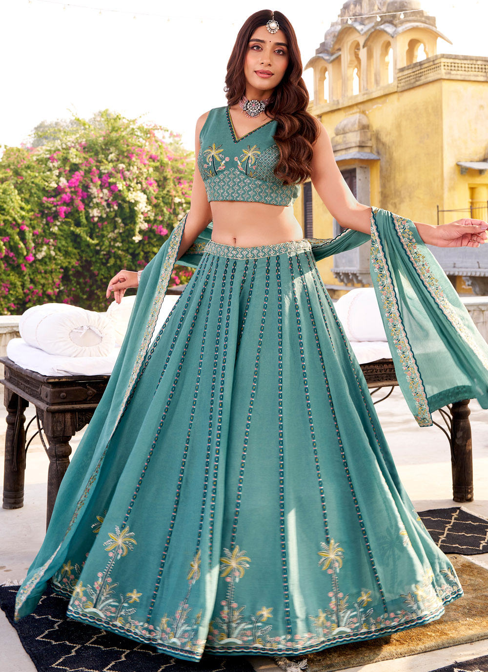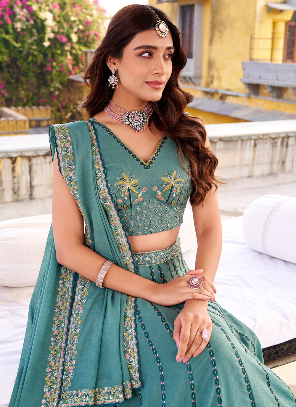 This sea green crush lehenga choli is ideal for women who love soft shades with festive appeal. The embroidered detailing enhances the outfit while keeping it light and comfortable for long celebrations. Comes with matching choli and dupatta.