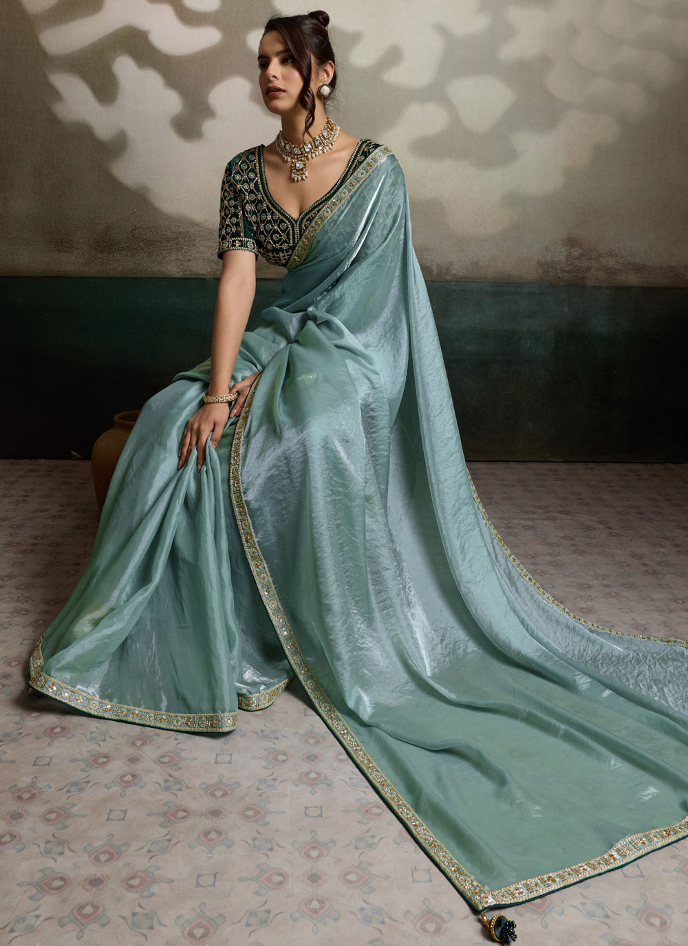 Enhance your ethnic wardrobe with this Sea Green Embroidered Border Work Velvet Satin Classic Saree. The soft velvet satin fabric creates a rich texture, while the elegant sea green shade gives a fresh and sophisticated look. Comes with matching blouse.