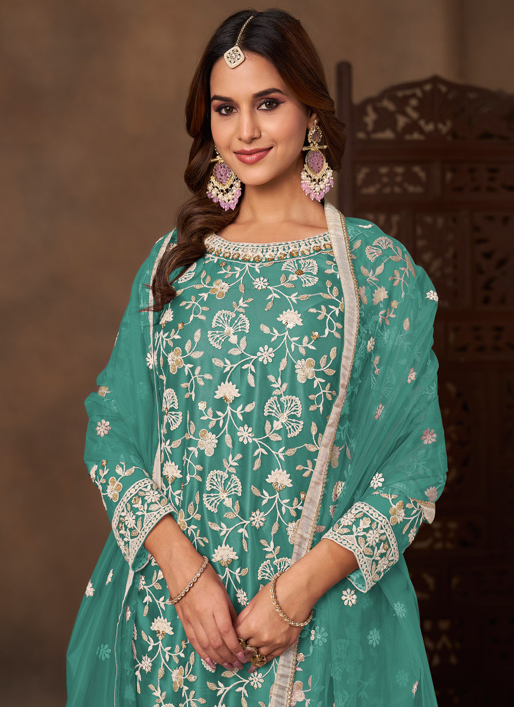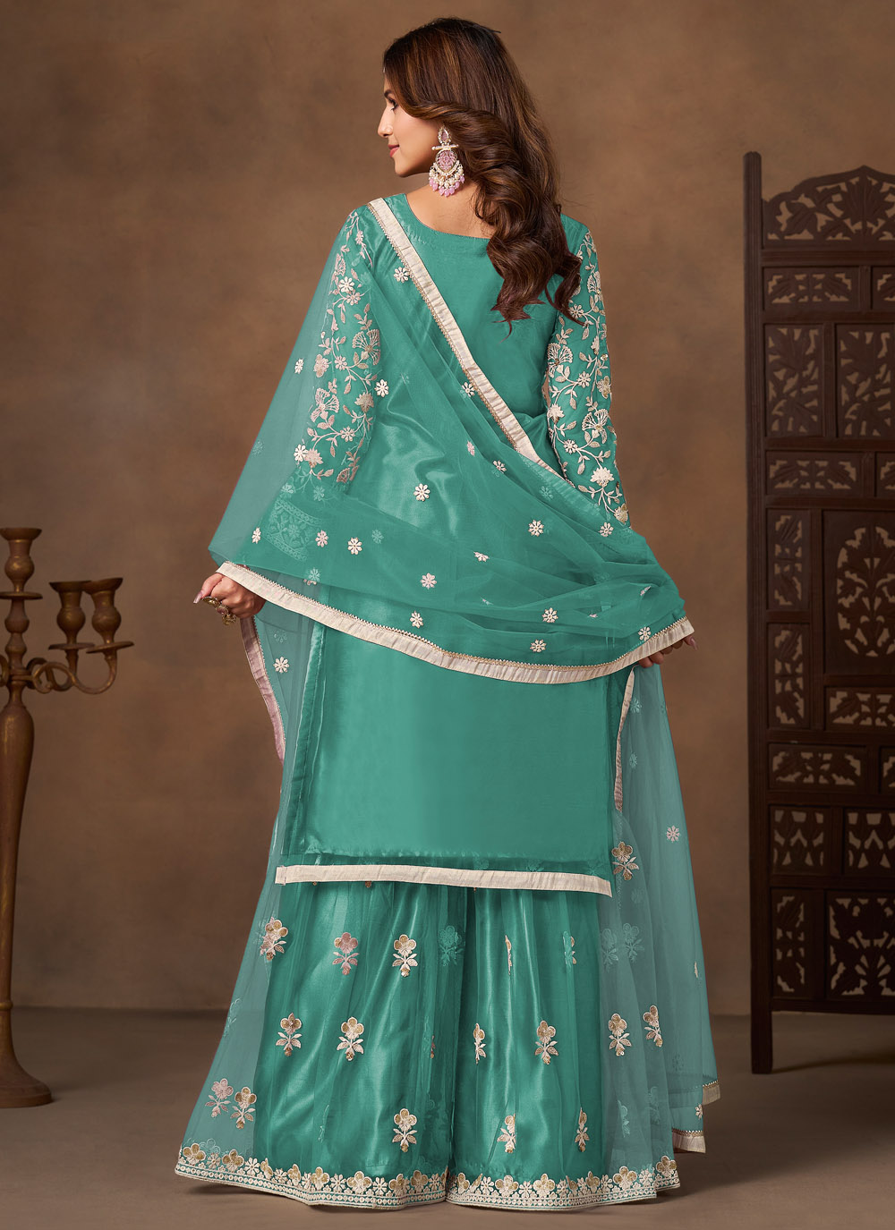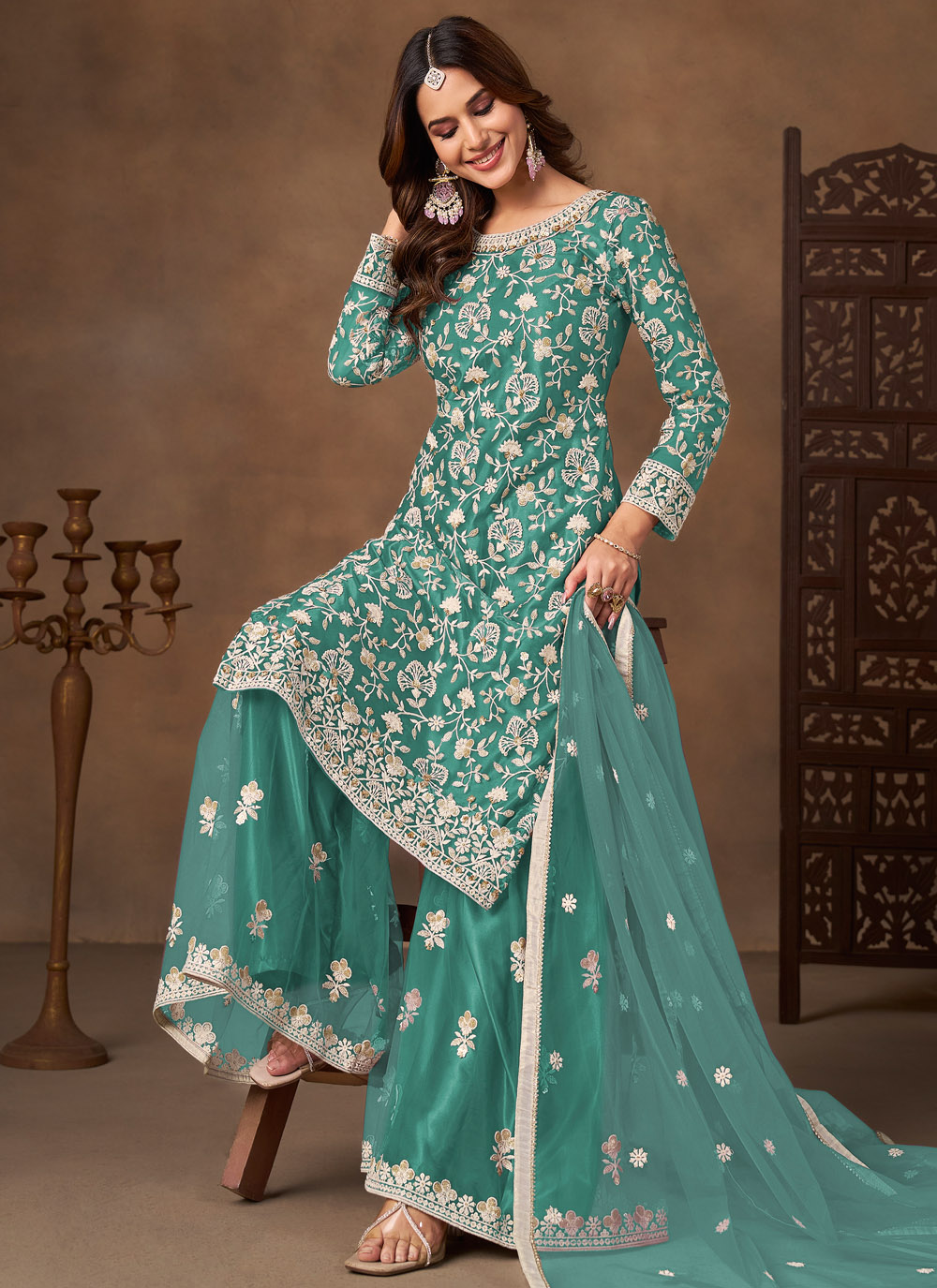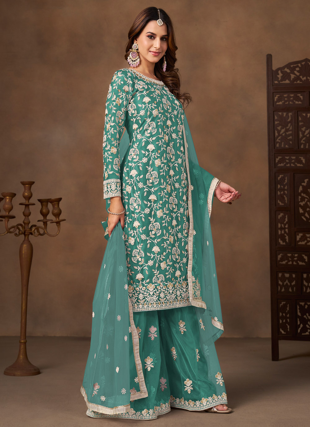 This designer palazzo salwar suit in sea green is an elegant blend of tradition and trend. The embroidery flows across the net fabric in eye-pleasing motifs, paired with sequins that sparkle gently under lights. Comes with matching bottom and dupatta.