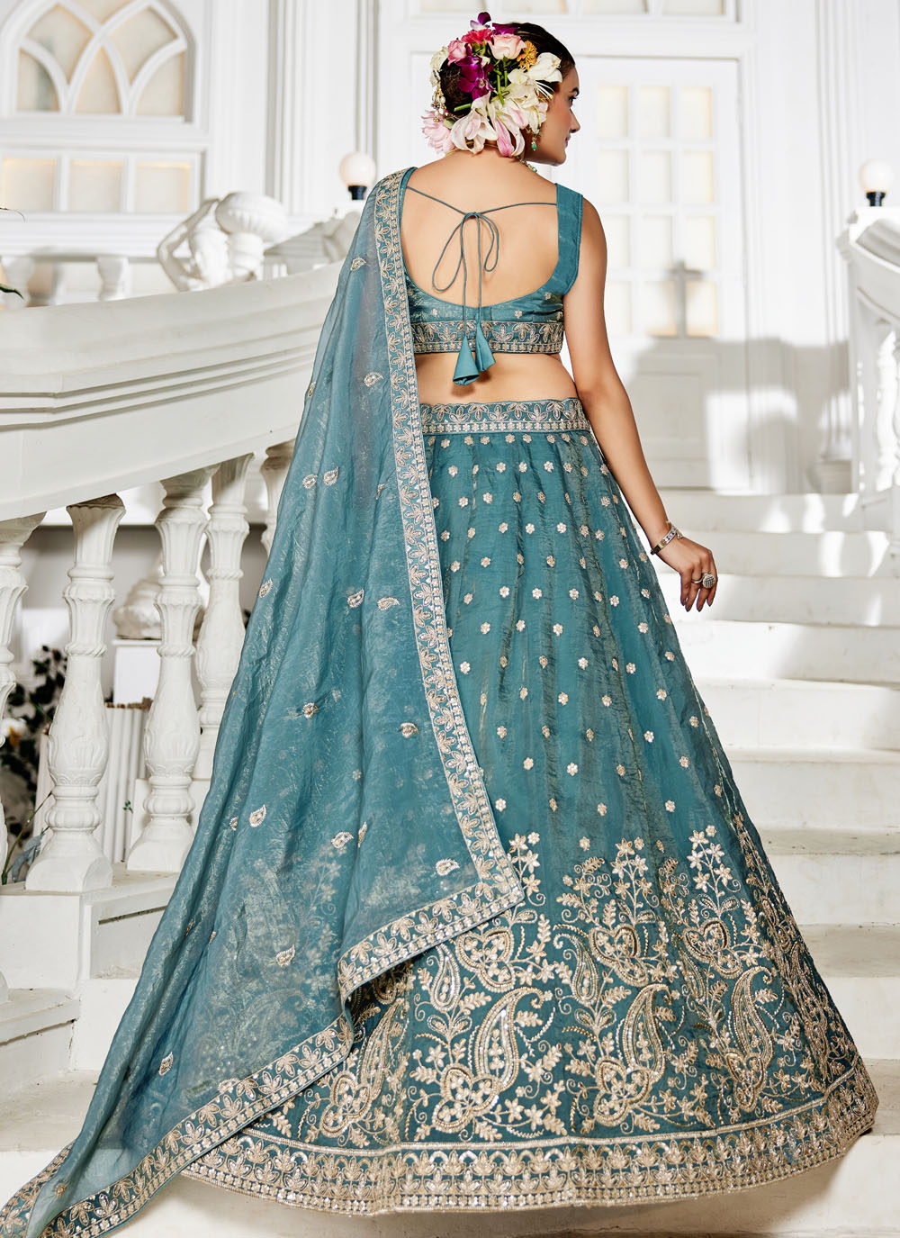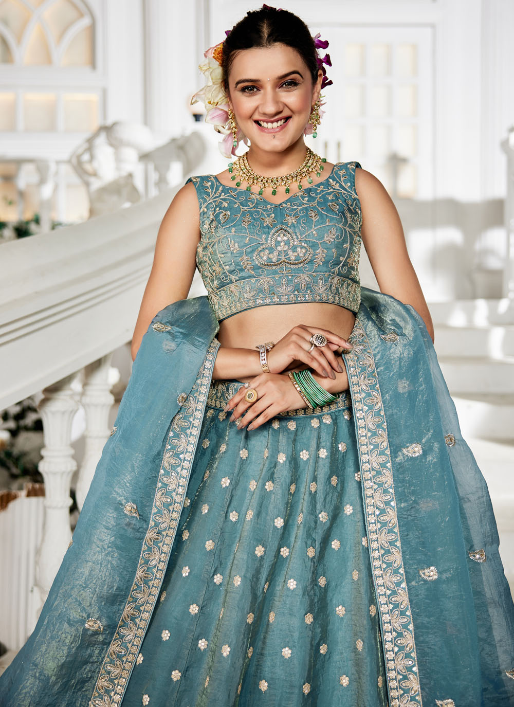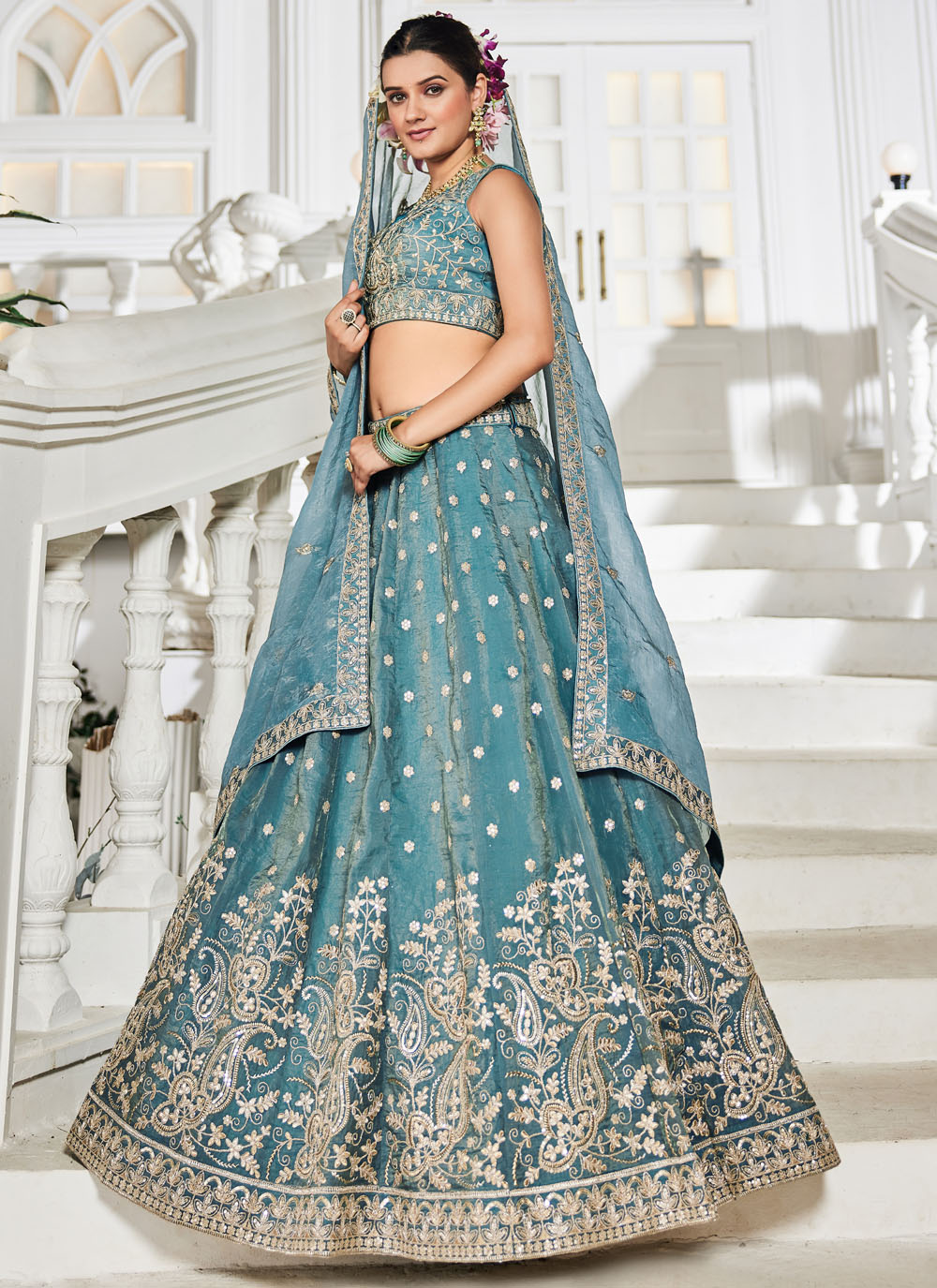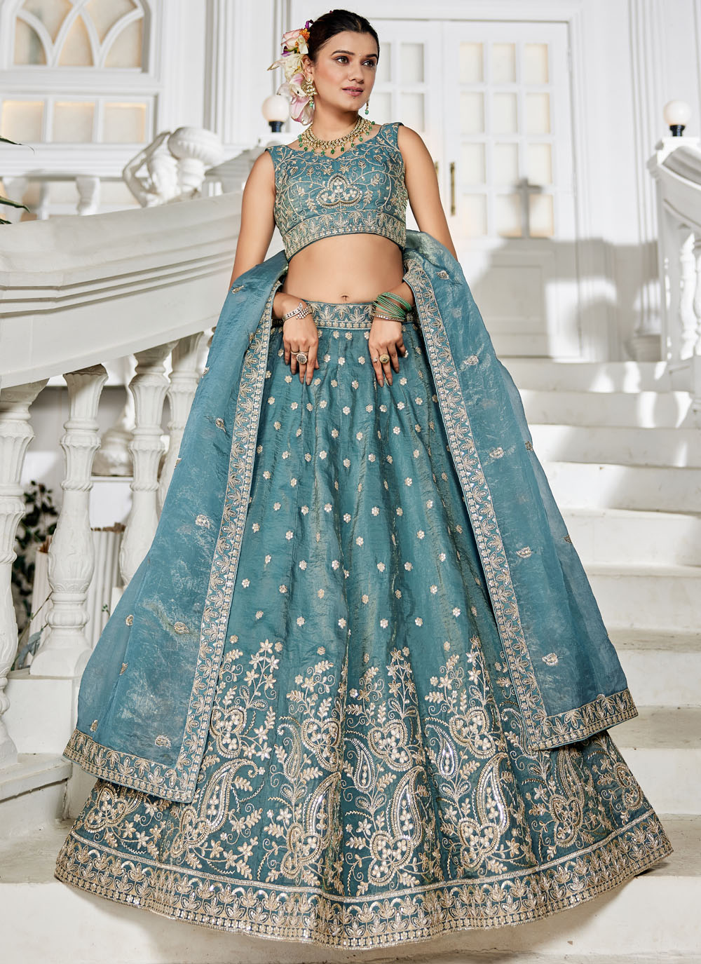 Step into the spotlight in this refreshing sea green lehenga choli, exquisitely detailed with shimmering sequins and intricate zari embroidery. Its contemporary cut and graceful flow make it a perfect choice for modern celebrations. Comes with matching choli and dupatta.