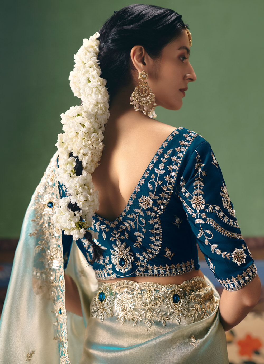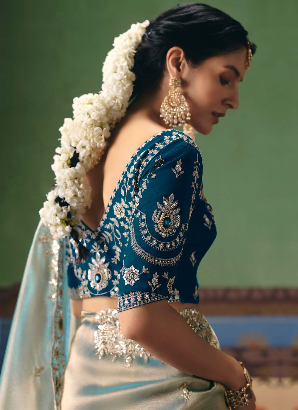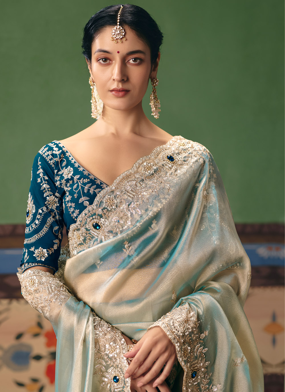 Enhance your festive look with this beautifully designed Sea Green Pearls Sequins Embroidered Designer Saree. The smooth fancy fabric ensures effortless draping, while the detailed embroidery adds richness and elegance. Comes with matching blouse.