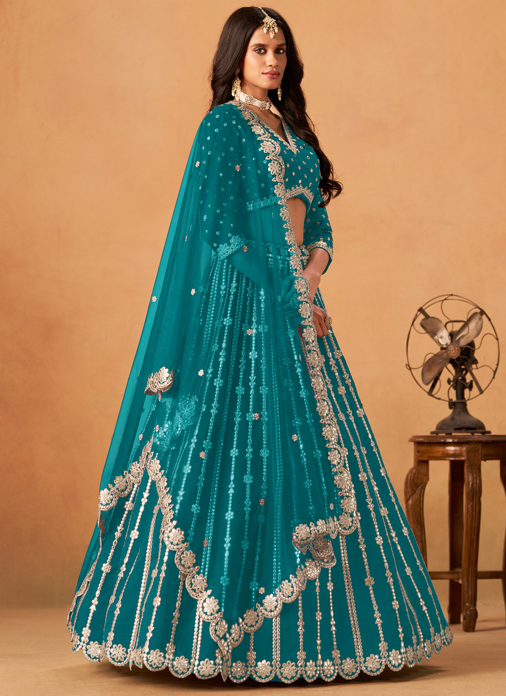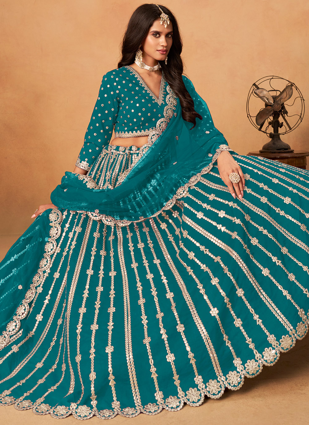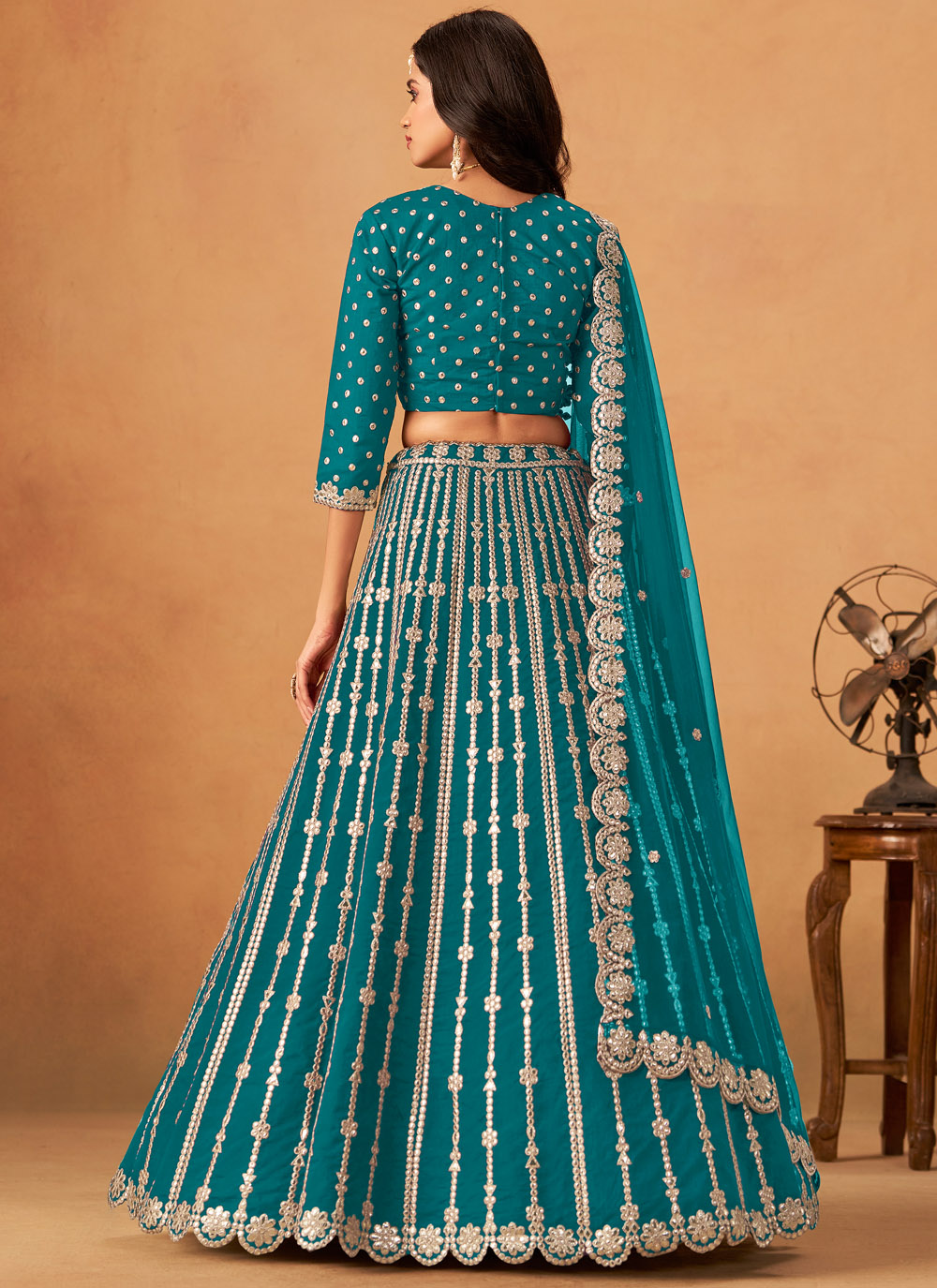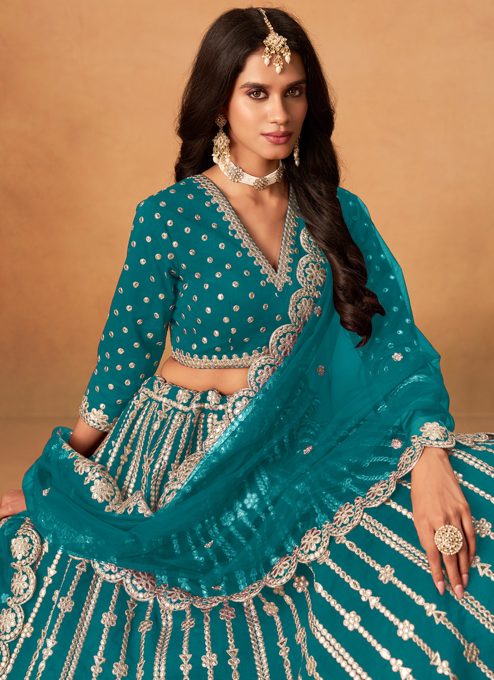 Designed in a refreshing sea green shade, this lehenga choli combines traditional embroidery with delicate gota highlights, giving it a festive yet sophisticated look. Perfect for weddings and cultural events. Comes with matching choli and dupatta.