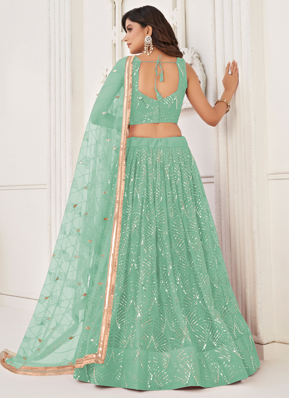 Elevate your ethnic wardrobe with this sea green net designer lehenga choli. The delicate embroidery work and soft color tone create a refined look, perfect for ceremonies, festive gatherings, and wedding functions. Comes with matching choli and dupatta.