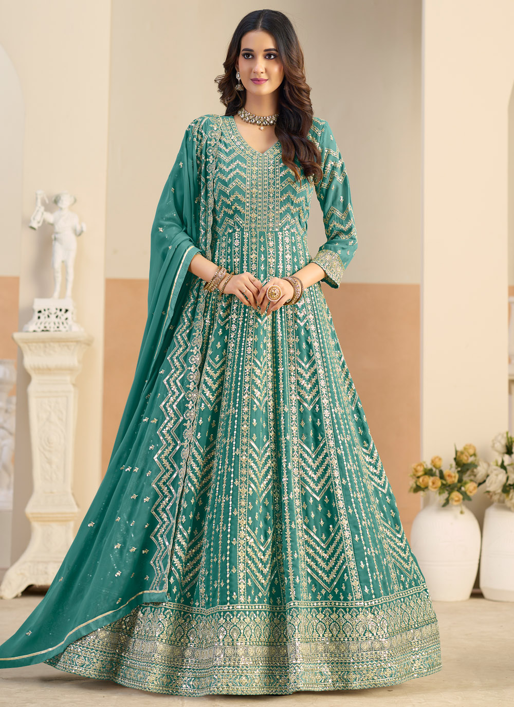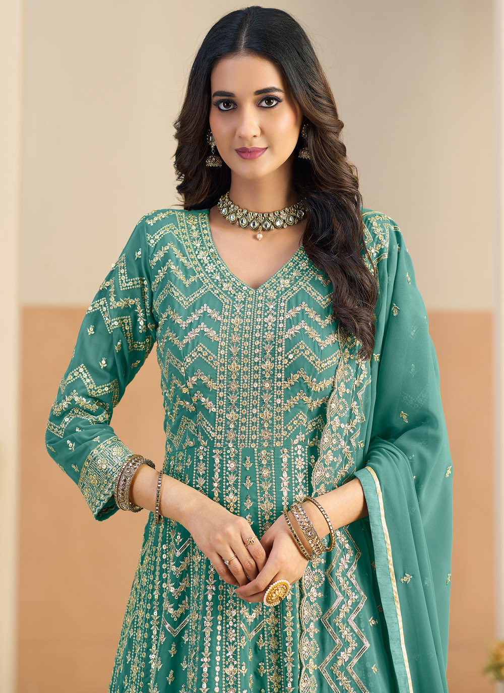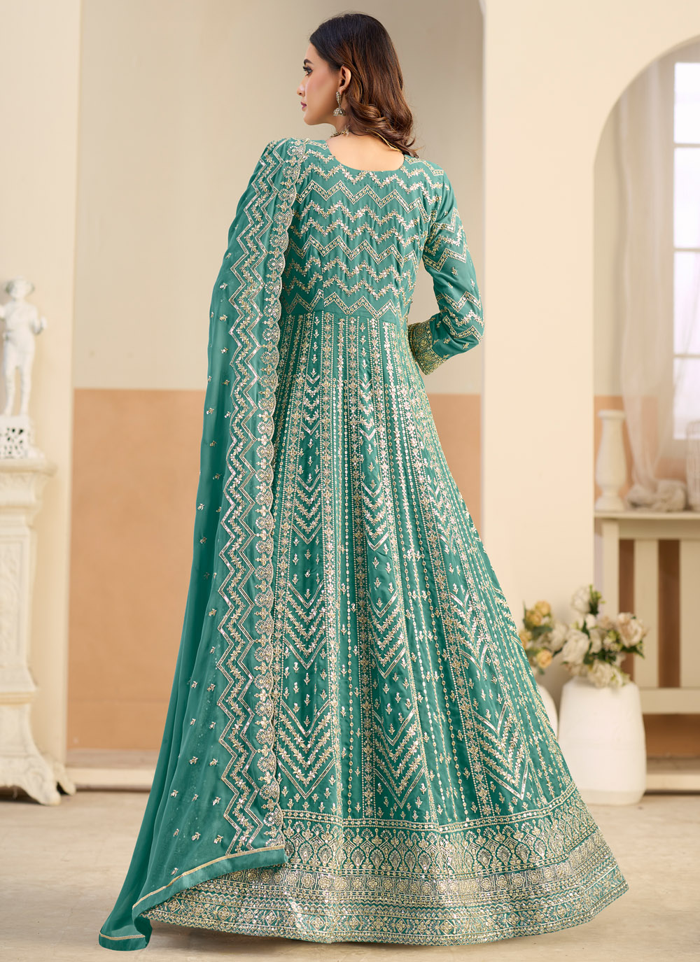 This sea green Anarkali suit features intricate sequins embroidery that adds richness and depth to the outfit. The premium faux georgette fabric drapes elegantly, creating a stylish and sophisticated look. Comes with matching bottom and dupatta.