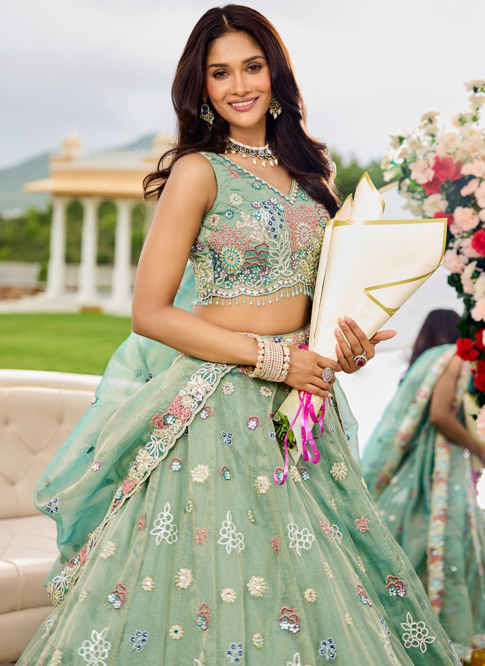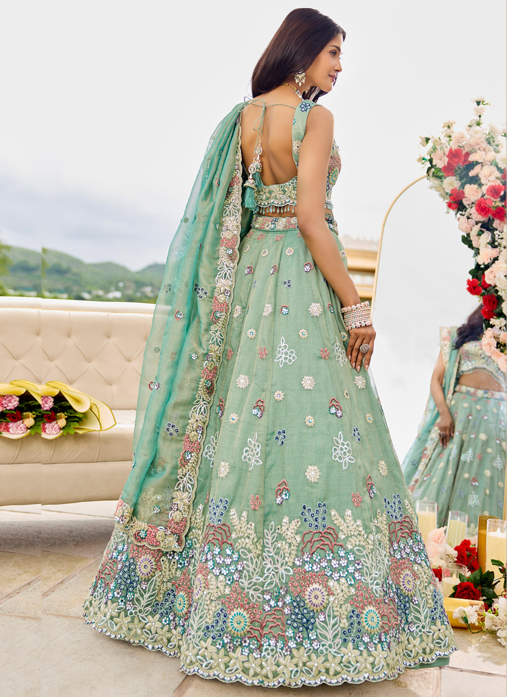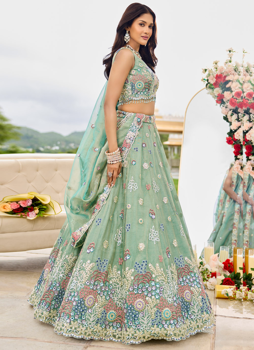 This Readymade Satin Silk Lehenga Choli in Sea Green combines thread, zari, sequins and stone embroidery for a rich ethnic look. A graceful choice for bridesmaids, festive gatherings and cultural events. Comes with matching choli and dupatta.