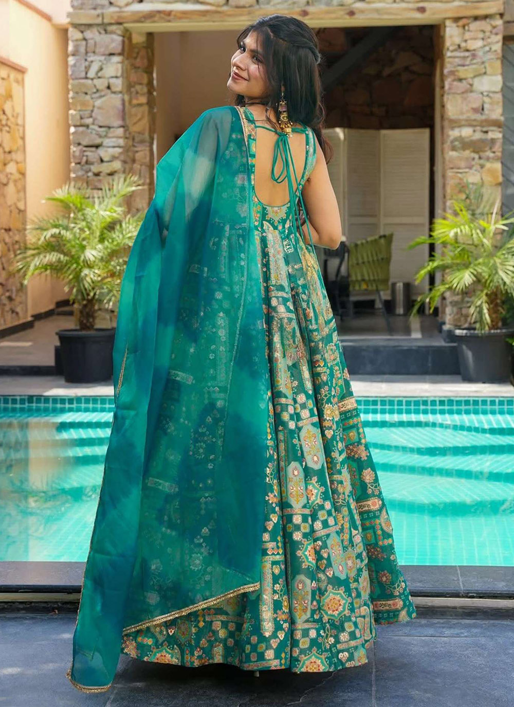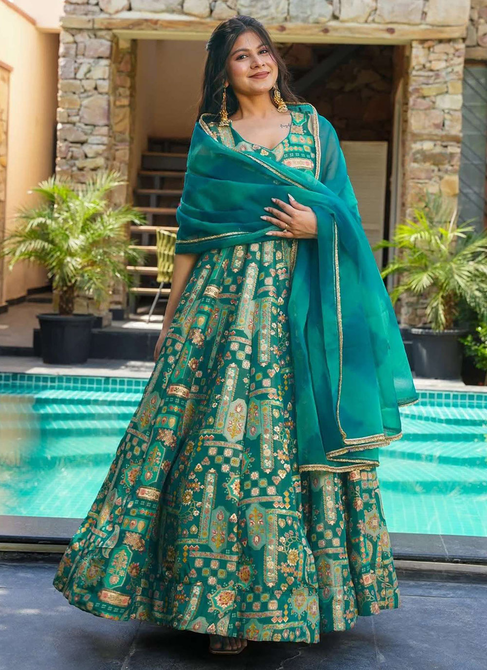 This trendy gown in serene sea green is crafted from premium silk and adorned with artistic digital prints. Its ready-to-wear design and fluid drape create a fashionable look perfect for festive and semi-formal occasions. Comes with matching dupatta.