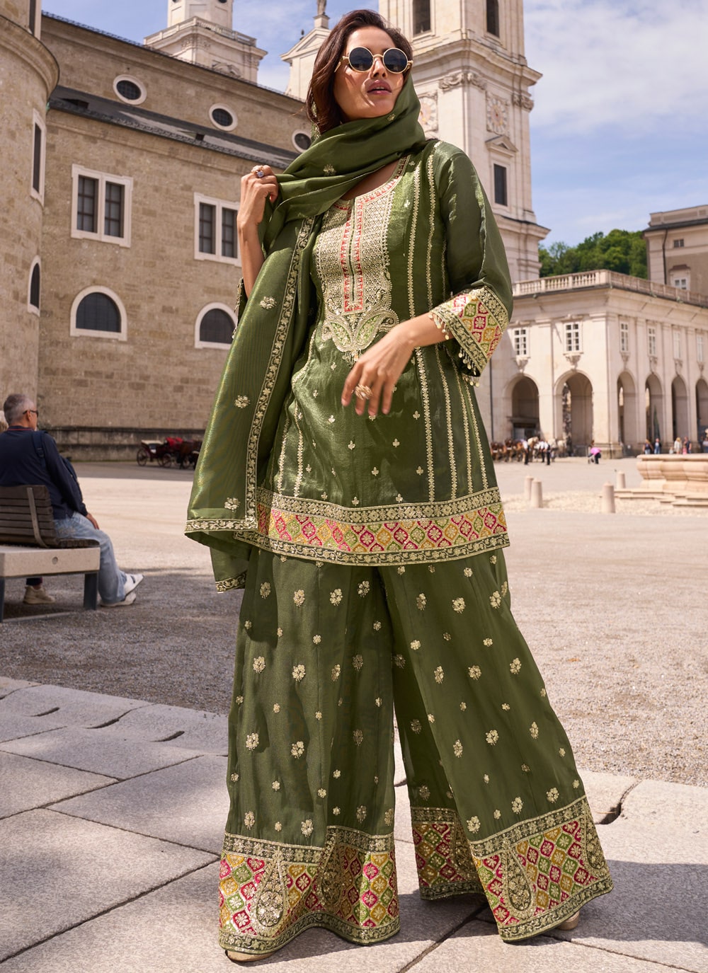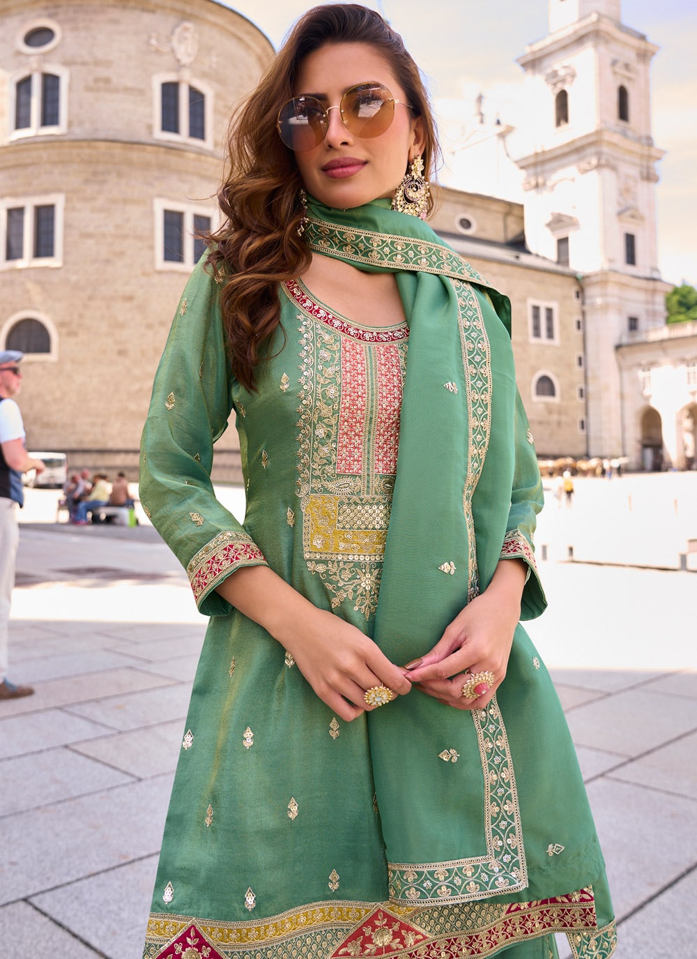 The Sea Green Silk Salwar Suit offers effortless style with embroidery. Its soft silk fabric and elegant color make it an excellent choice for festive and ceremonial occasions. Comes with matching bottom and dupatta.