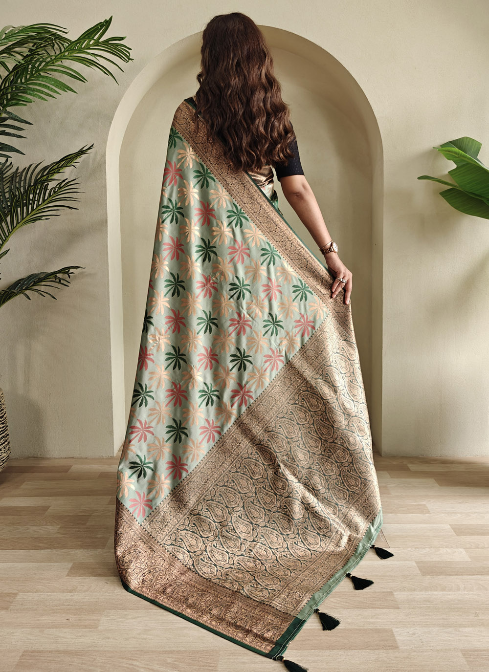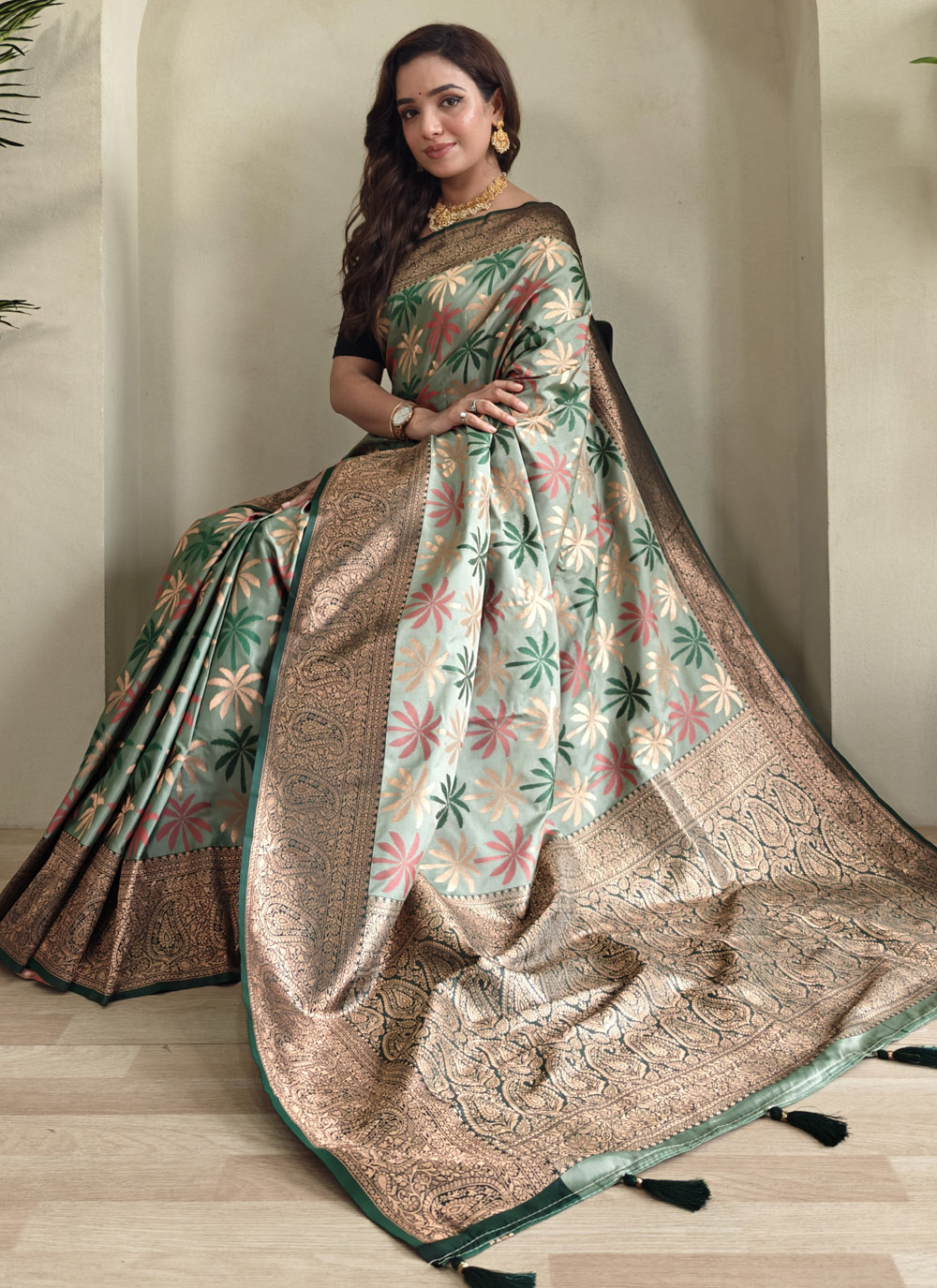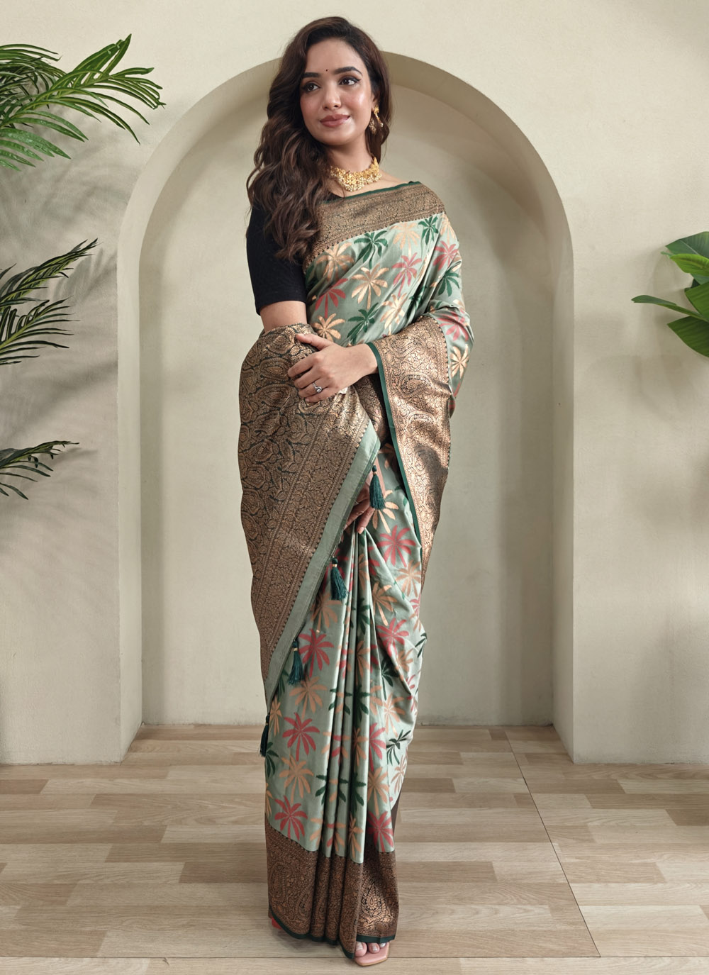 Woven from fine silk in a soothing sea green shade, this saree features artistic jacquard patterns that add depth and richness. Perfect for formal events or traditional festivities, it offers a graceful look that blends heritage with class. Comes with matching blouse.