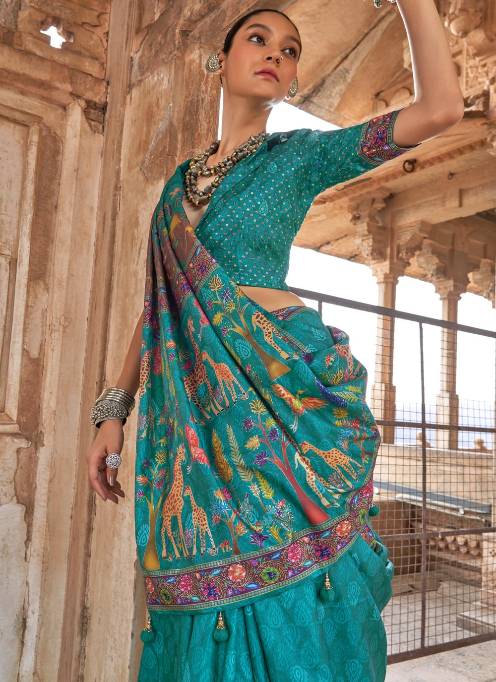 This traditional sea green silk saree with prints is crafted for women who value subtle sophistication. The intricate print detailing enhances the silk’s natural sheen, giving it a refined look that works beautifully for festive wear. Comes with matching blouse.