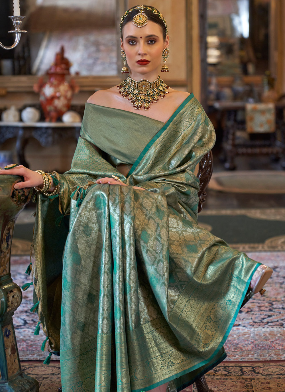 This sea green silk saree stands out with its soft shine and detailed zari weaving. The classic shade adds calm elegance, making it a beautiful choice for festive gatherings and traditional celebrations. Comes with matching blouse.