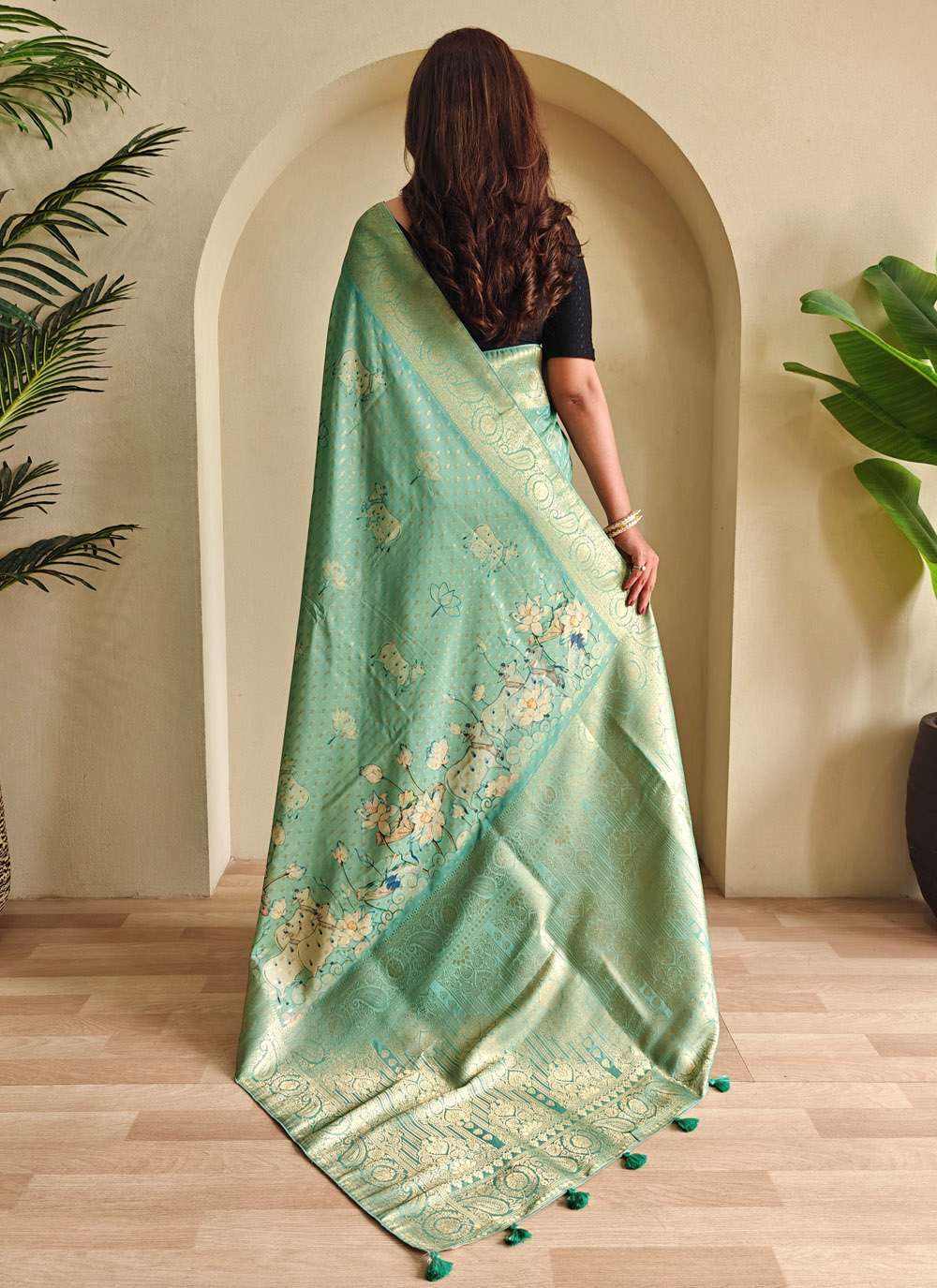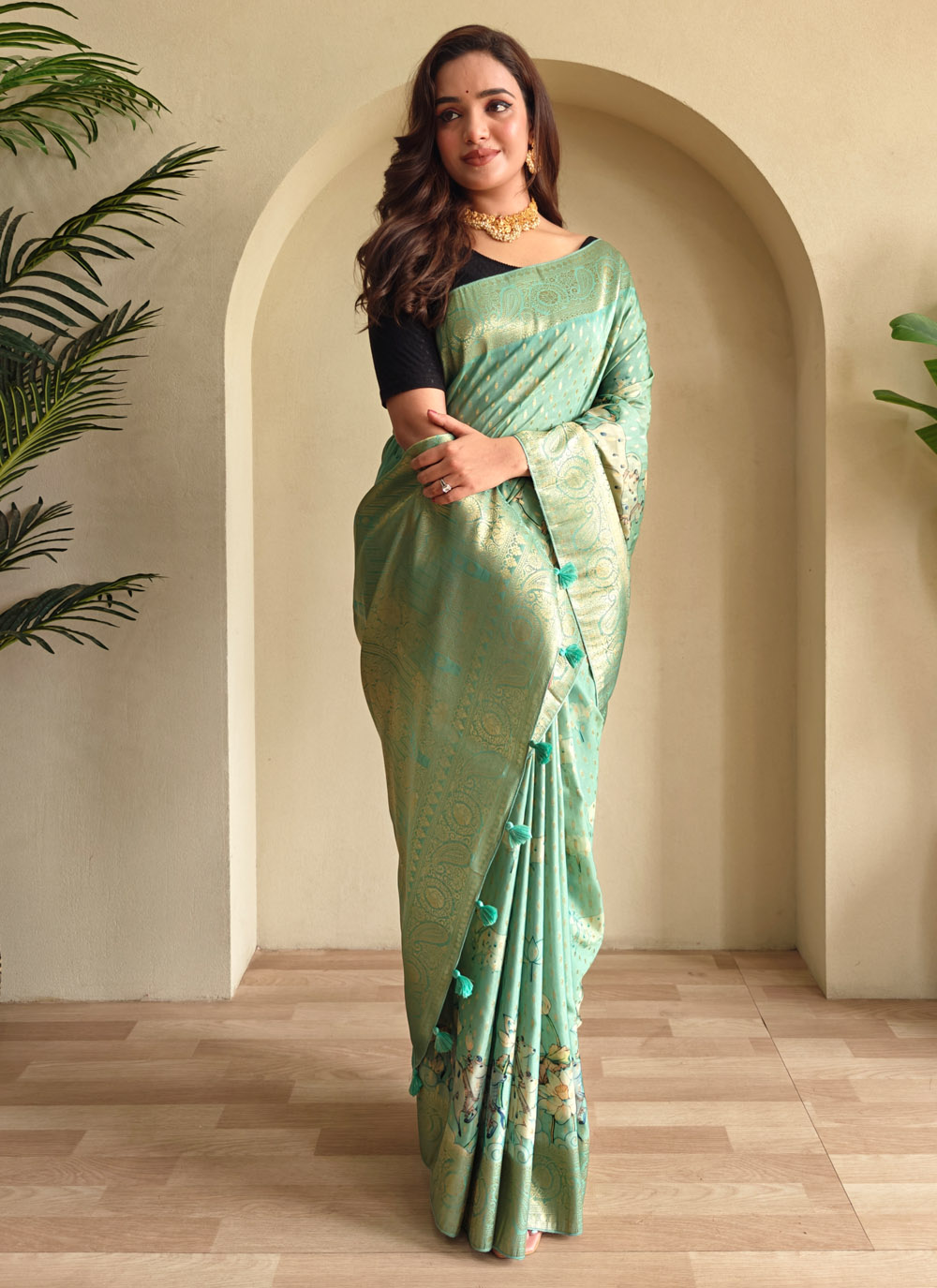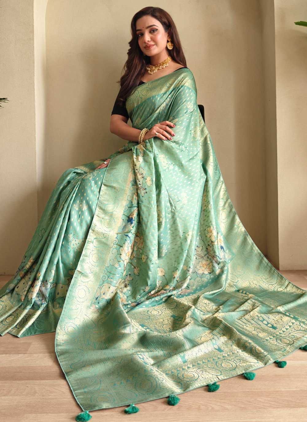 Grace your wardrobe with this stunning Sea Green Saree in Viscose Georgette, showcasing artistic digital prints and elegant weaving work. A fresh and trendy pick for festive or modern ethnic occasions. Comes with matching blouse.