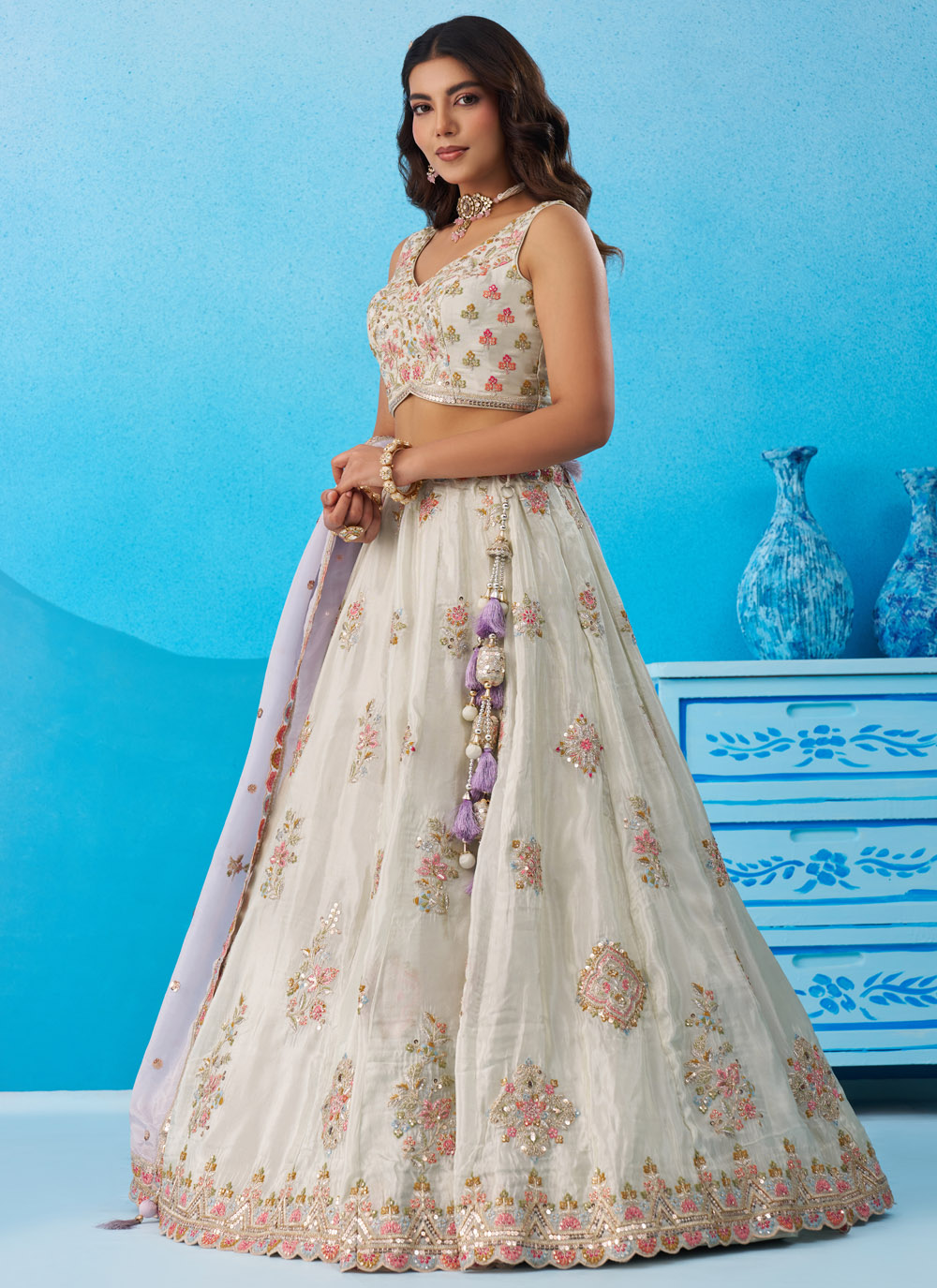 This Sea Green Zari Sequins Embroidered Tissue Lehenga Choli showcases a beautiful blend of tradition and modern fashion. The rich tissue fabric enhances the elegance of the lehenga, while detailed zari and sequins embroidery add intricate patterns that elevate the overall design. Comes with matching choli and dupatta.