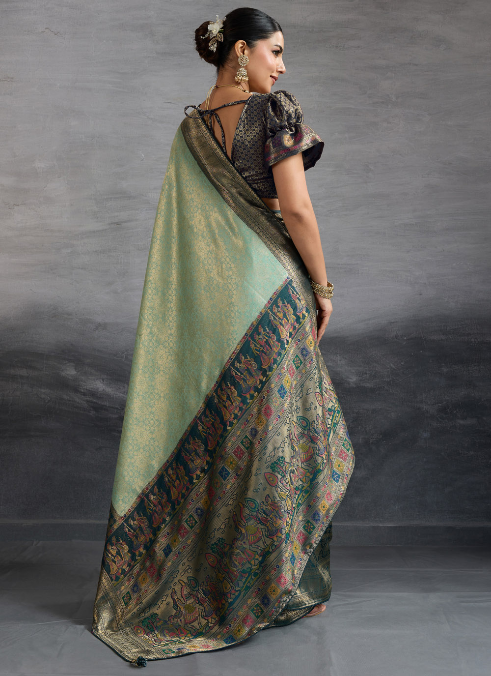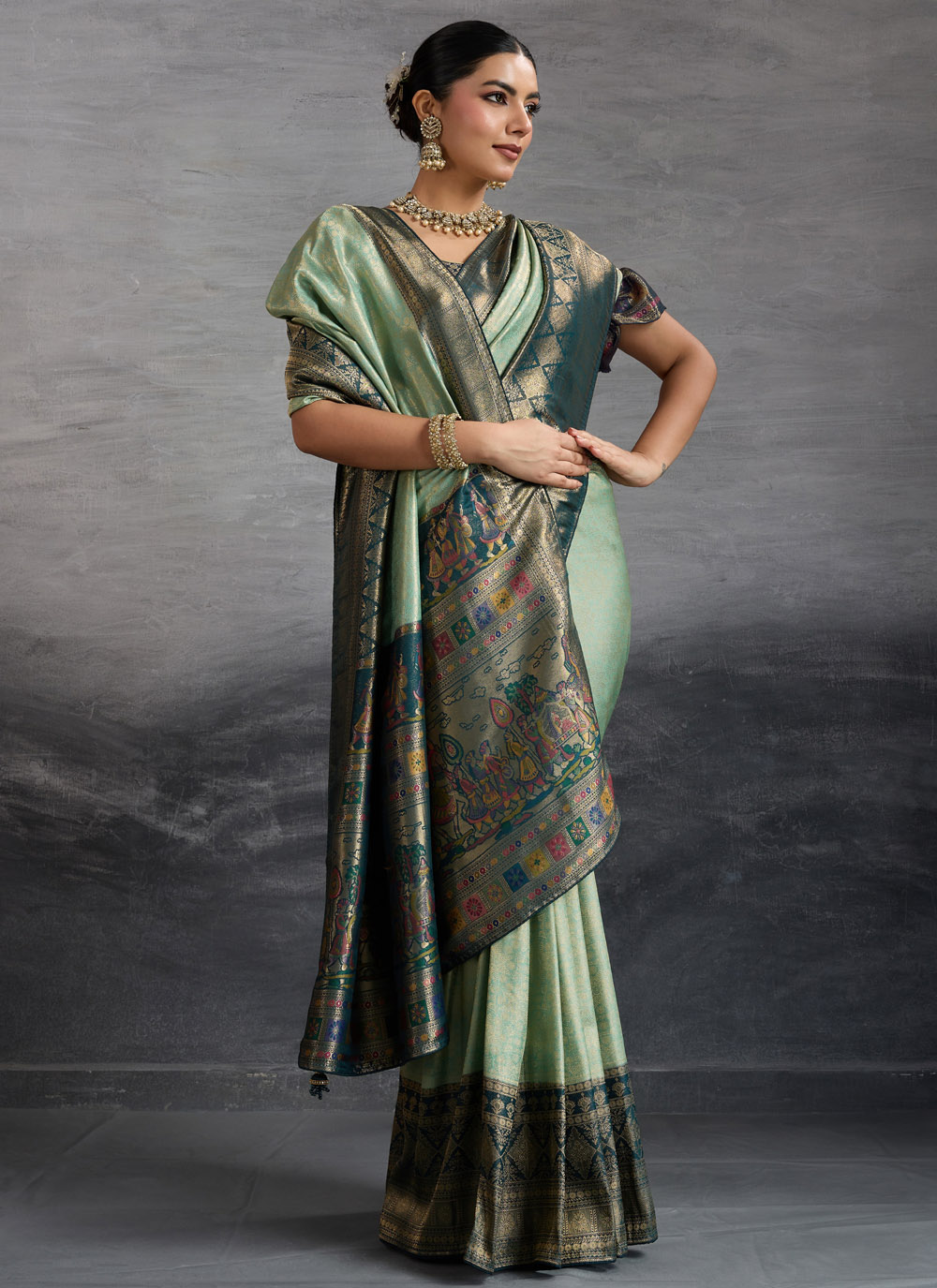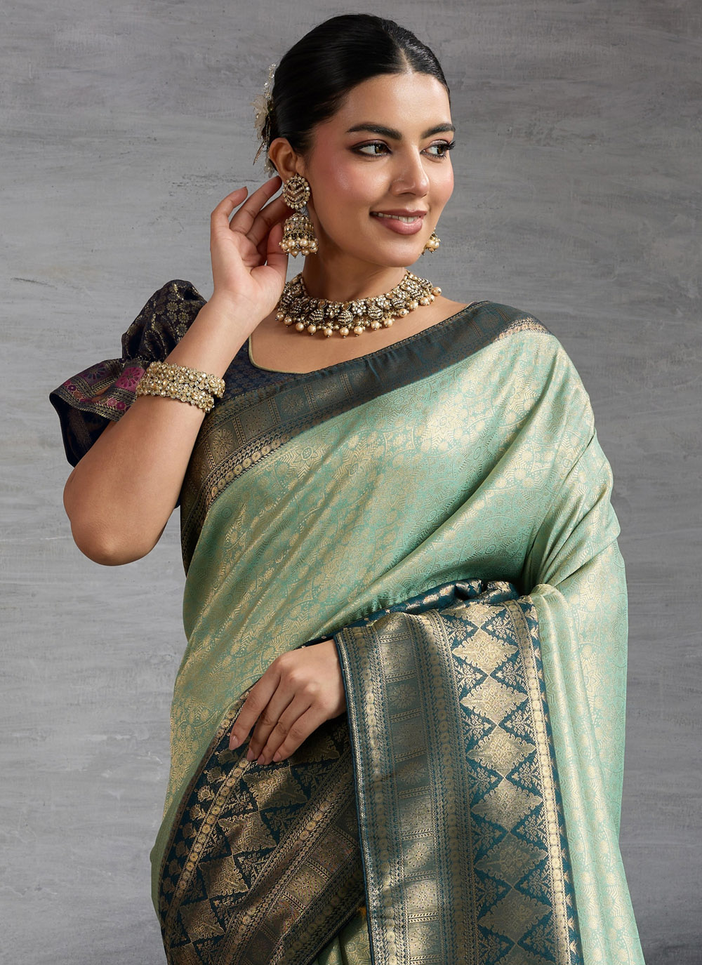 This sea green Kanjivaram silk saree is a masterpiece of grace, highlighted with exquisite meenakari and zari weaving. The soothing color reflects timeless beauty, while the intricate craftsmanship adds a regal touch, making it perfect for ceremonial and festive gatherings. Comes with matching blouse.