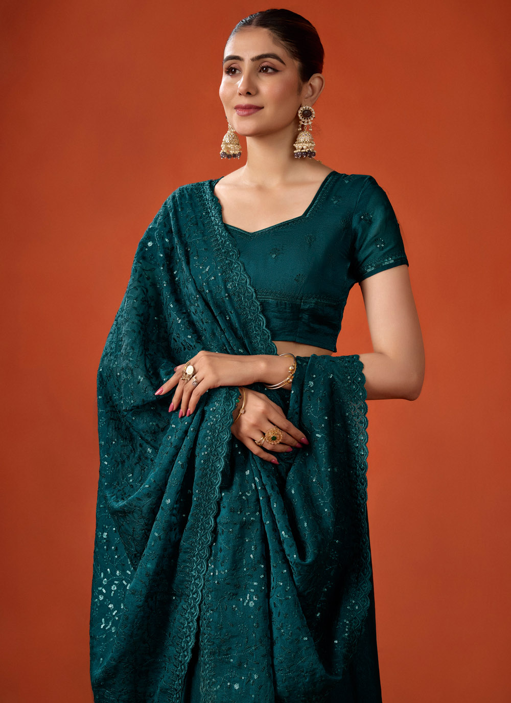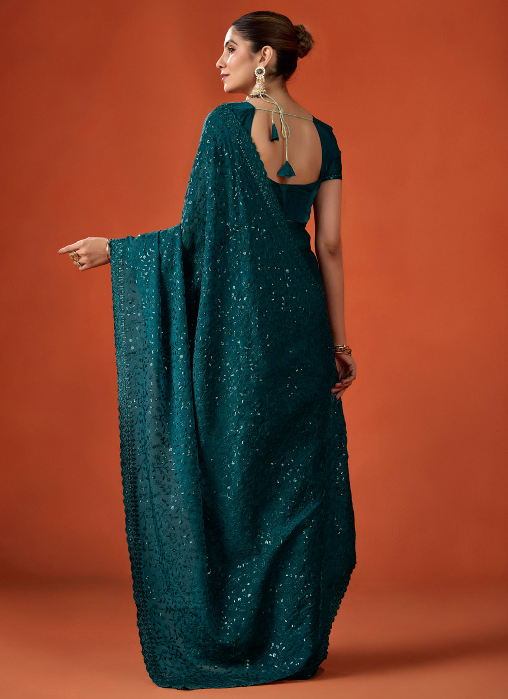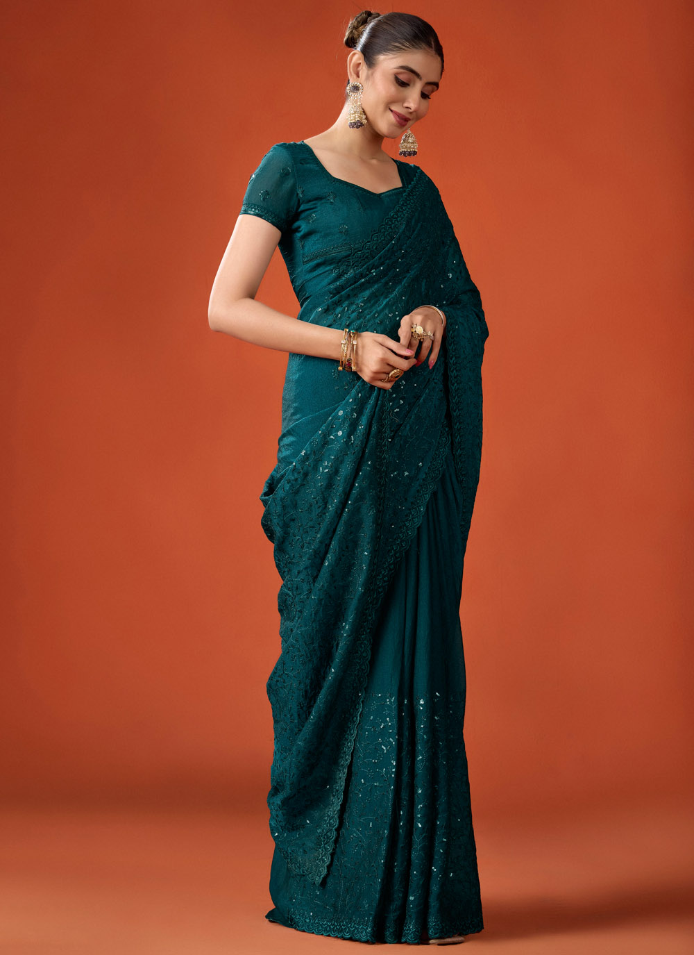 Upgrade your ethnic style with this Sequins Embroidered Moss Contemporary Saree in Green. The elegant moss fabric drapes smoothly, while shimmering sequins embroidery adds a modern festive touch. Comes with matching blouse.
