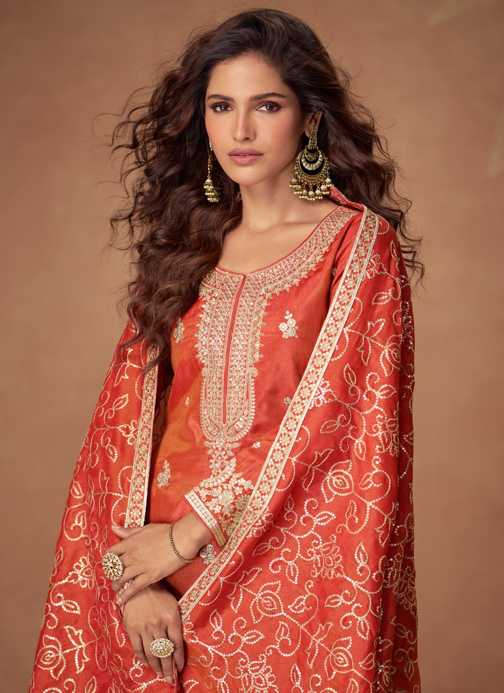 Brighten your festive look with this orange and rust shimmer silk salwar suit, beautifully embellished with intricate zari embroidery. The readymade style offers effortless elegance, making it perfect for weddings and traditional celebrations. Comes with matching bottom and dupatta.