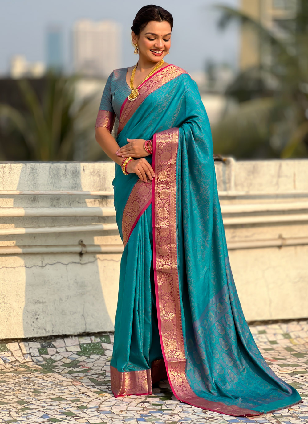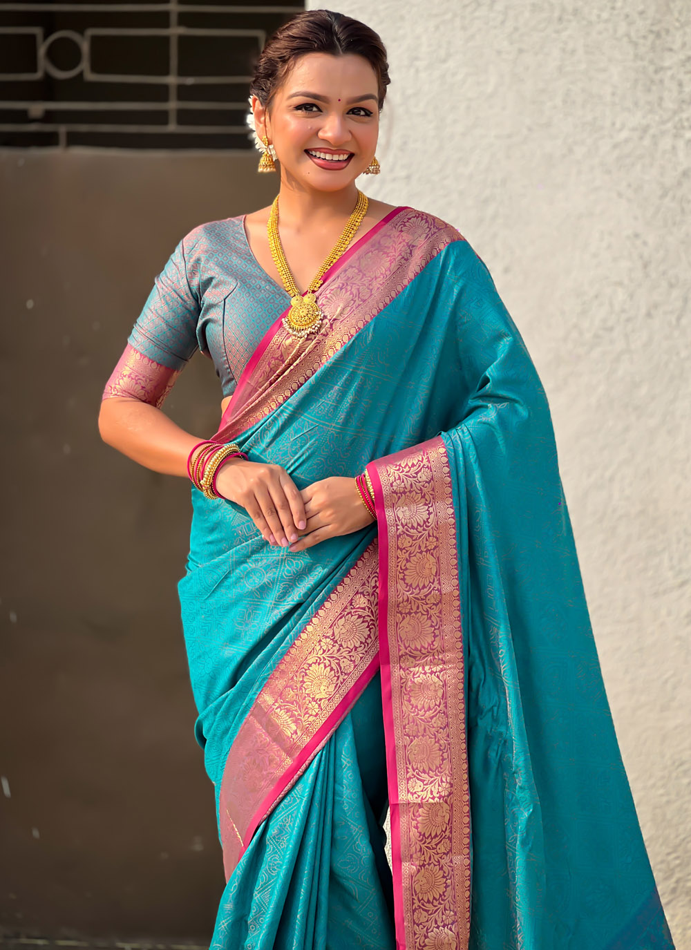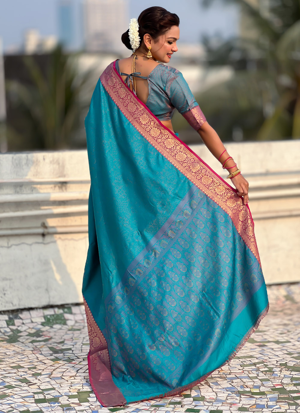 The Teal Silk Bandhej and Zari Weaving Work Saree captures heritage charm with modern elegance. Traditional bandhej designs blend beautifully with fine zari accents, offering a refined festive look. Comes with matching blouse.