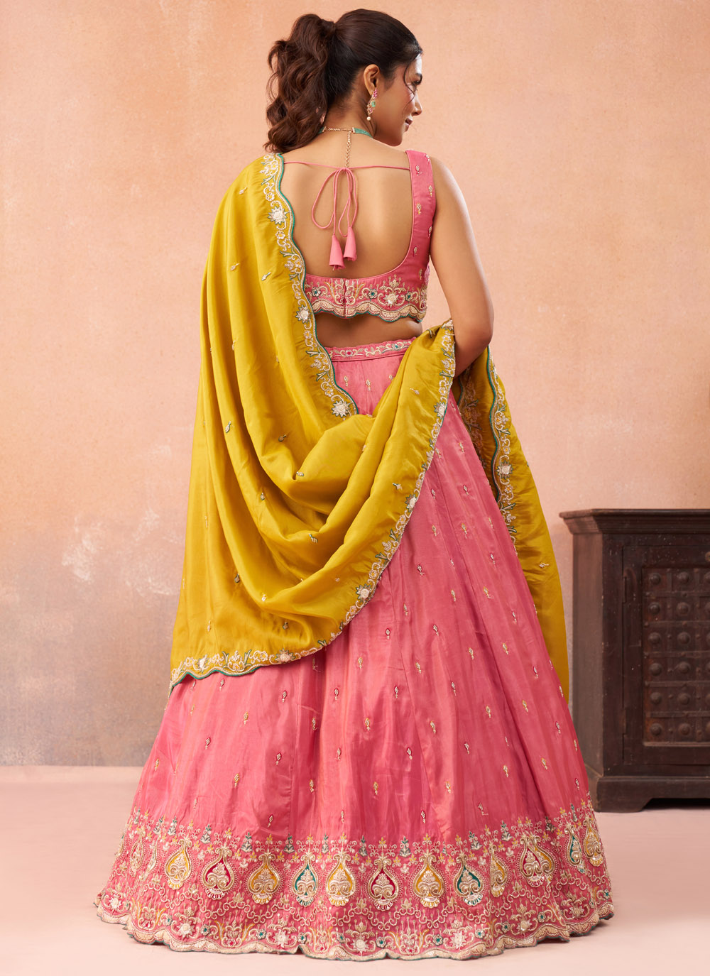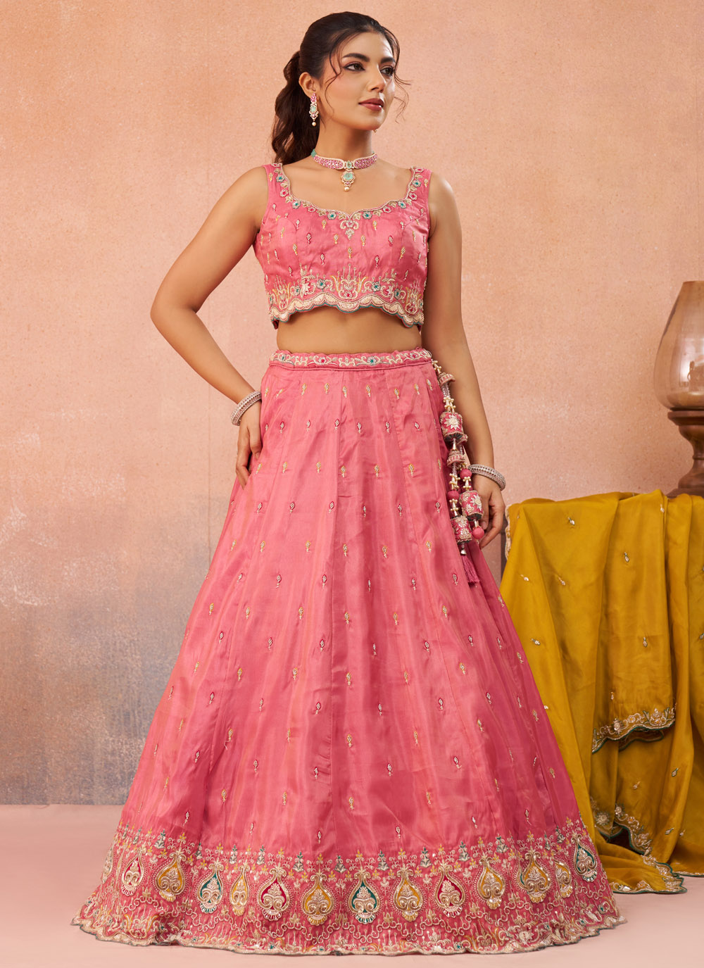 The Silk Beads Thread Sequins Embroidered Pink Wedding Lehenga Choli is designed for women who love elegant and ethnic wear. The delicate embroidery combined with sparkling sequins and bead work creates a rich and eye-catching design. Comes with matching choli and dupatta.