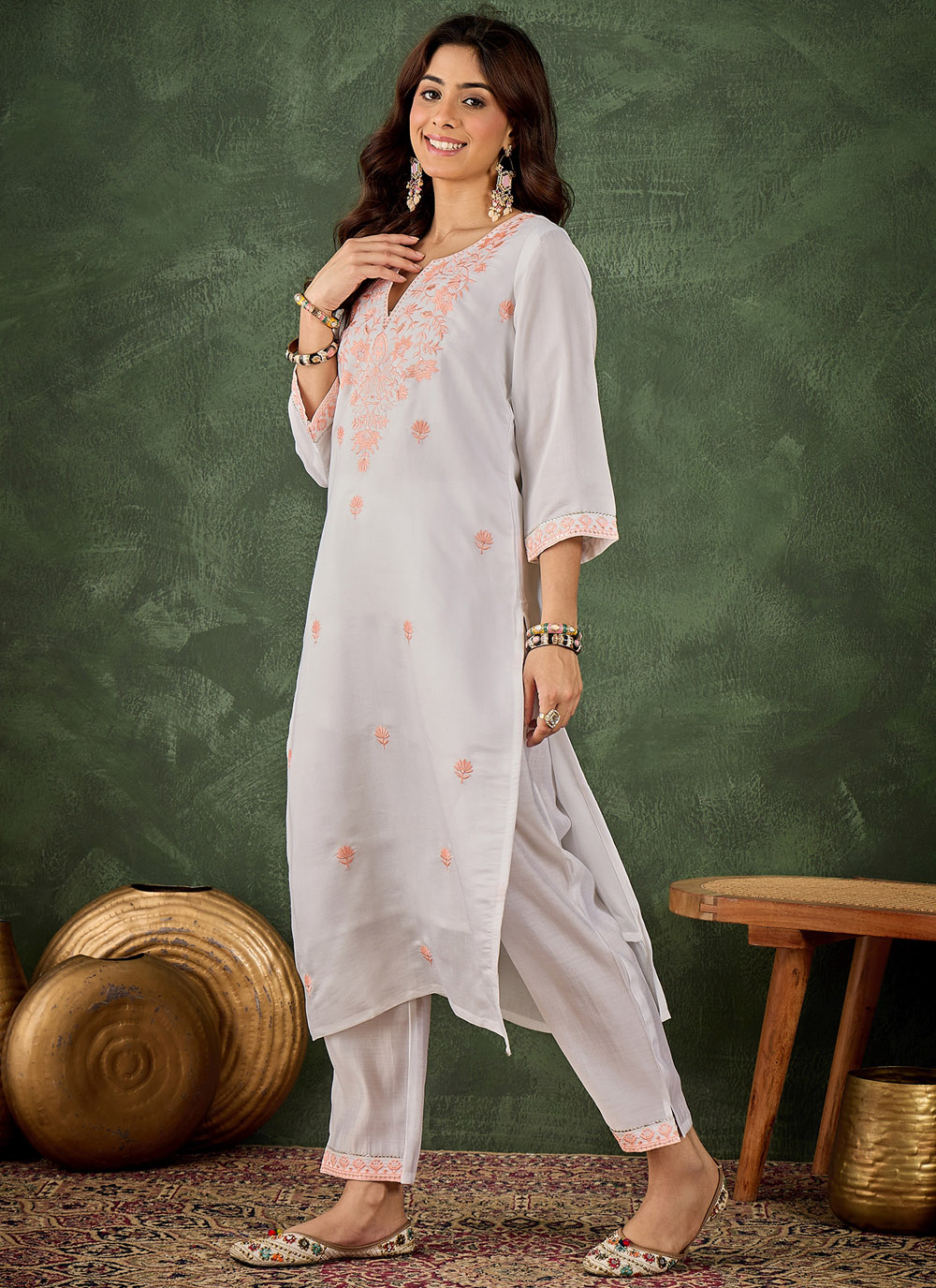 Enhance your everyday ethnic wardrobe with this Silk Blend Embroidered Off White Trendy Kurti. The graceful off white shade reflects simplicity and elegance, while the delicate embroidery adds a refined decorative touch.