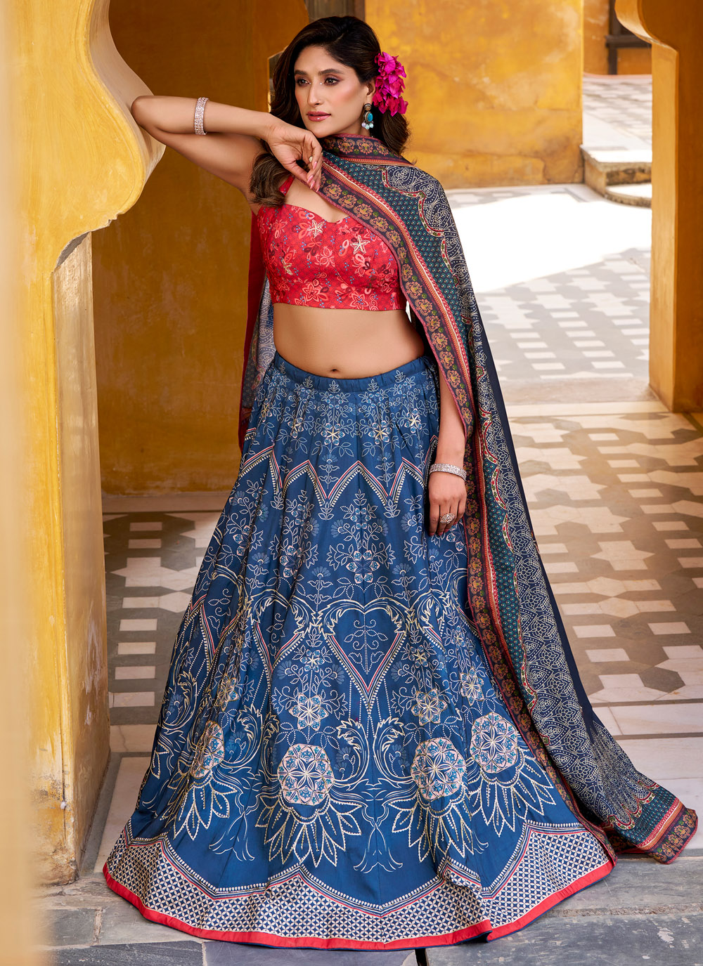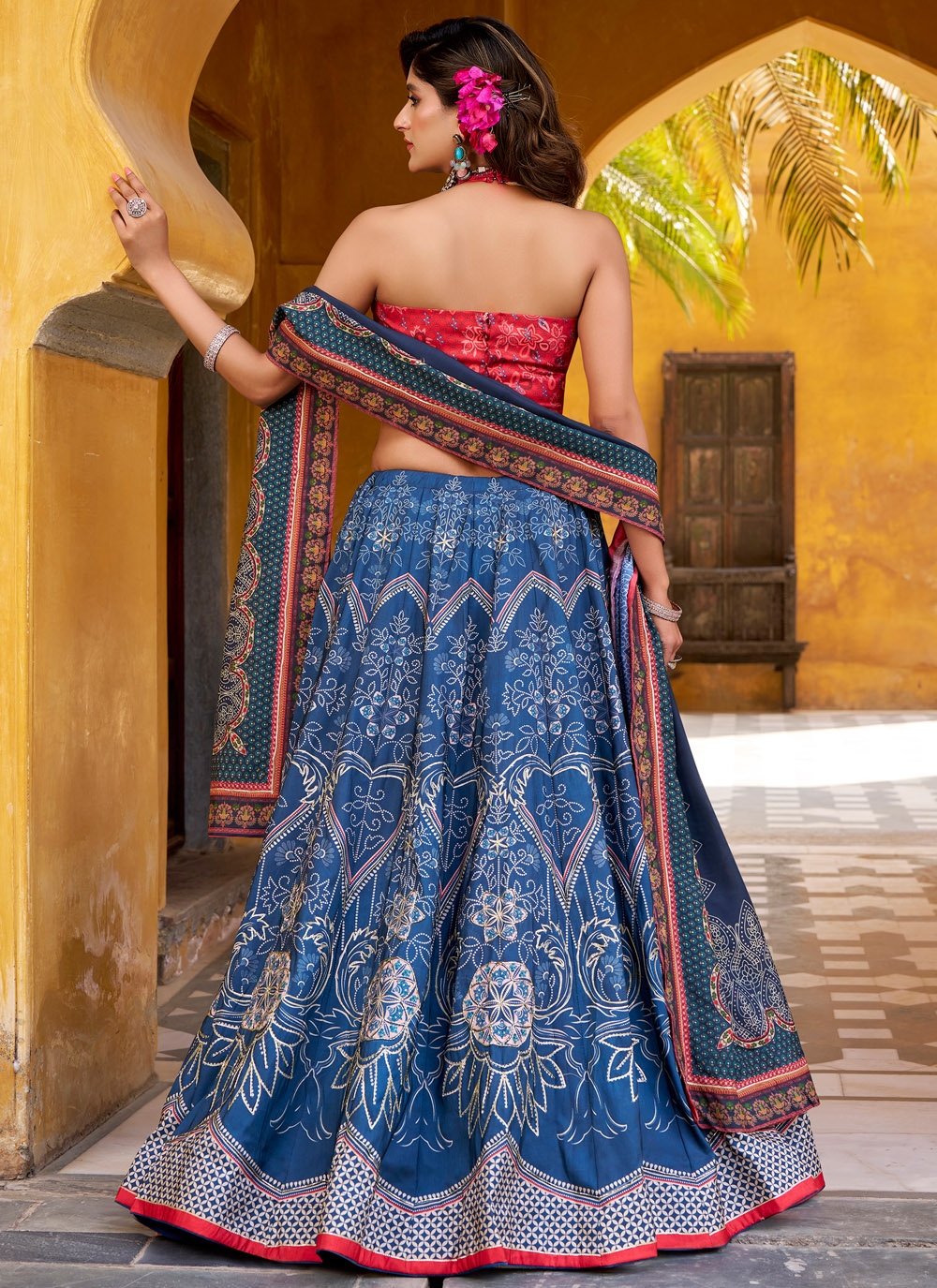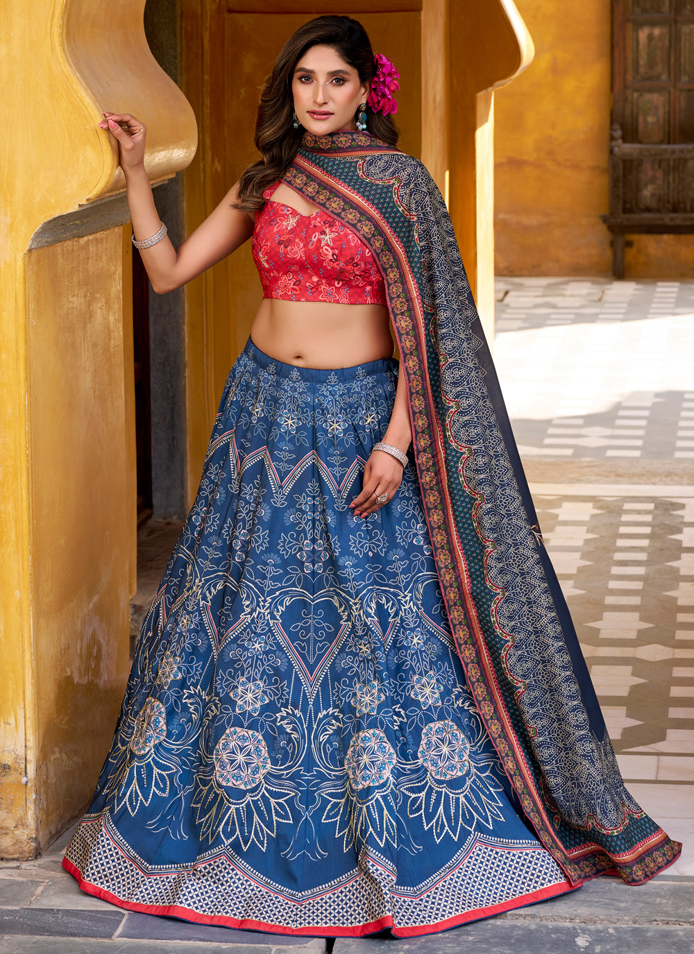 Add vibrant charm to your festive wardrobe with this Silk Blue Printed Lehenga Choli. Crafted from smooth silk fabric, the lehenga features beautiful printed patterns that create a graceful and eye-catching look. Comes with matching choli and dupatta.