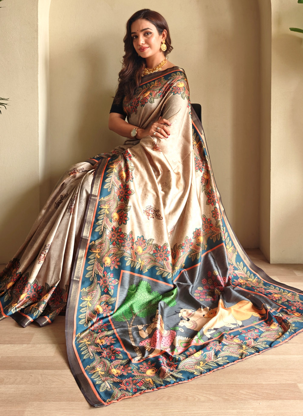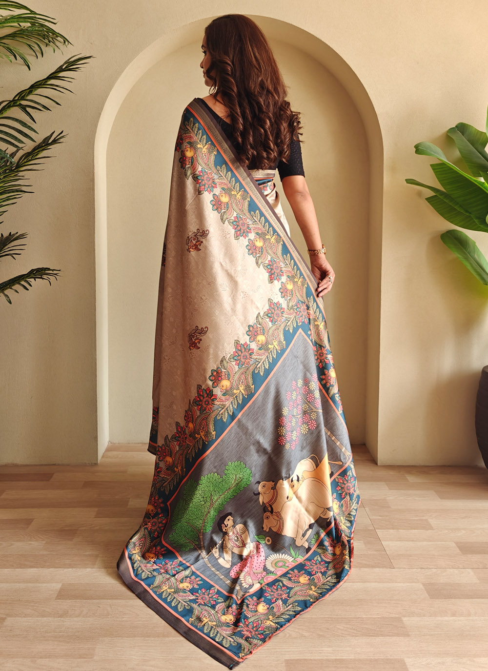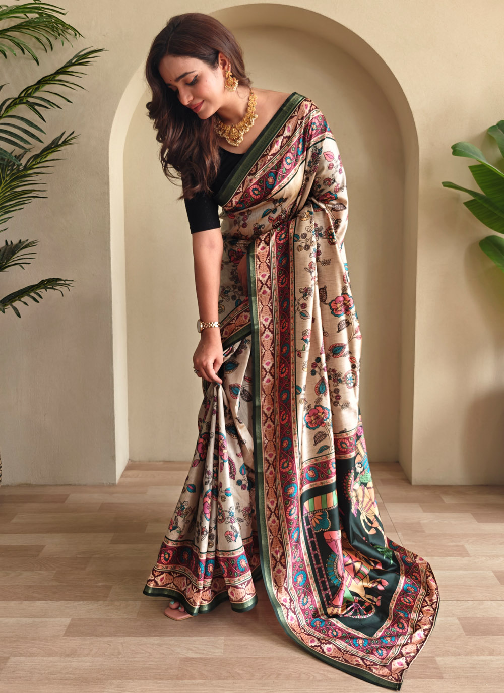 Crafted from rich silk and adorned with contemporary prints, this Beige Saree strikes the perfect balance between tradition and modern fashion. Comes with matching blouse.