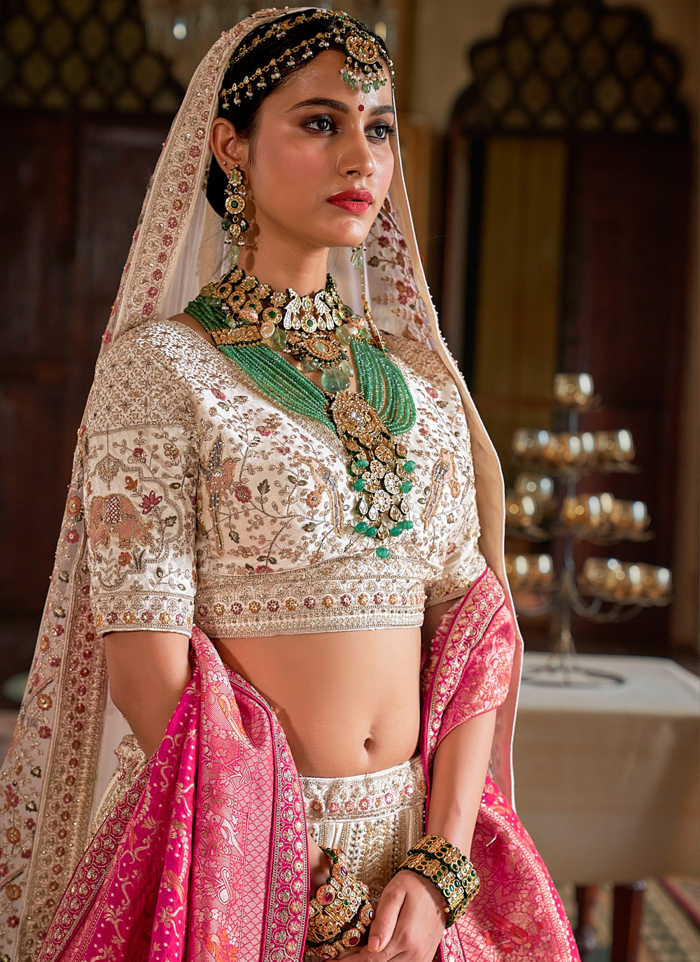 This reception-ready lehenga choli showcases refined artistry through thread embroidery, sequence highlights, pearl embellishments and zari weaving on premium silk fabric. Its subtle cream tone adds timeless appeal to special occasions. Comes with matching choli and dupatta.