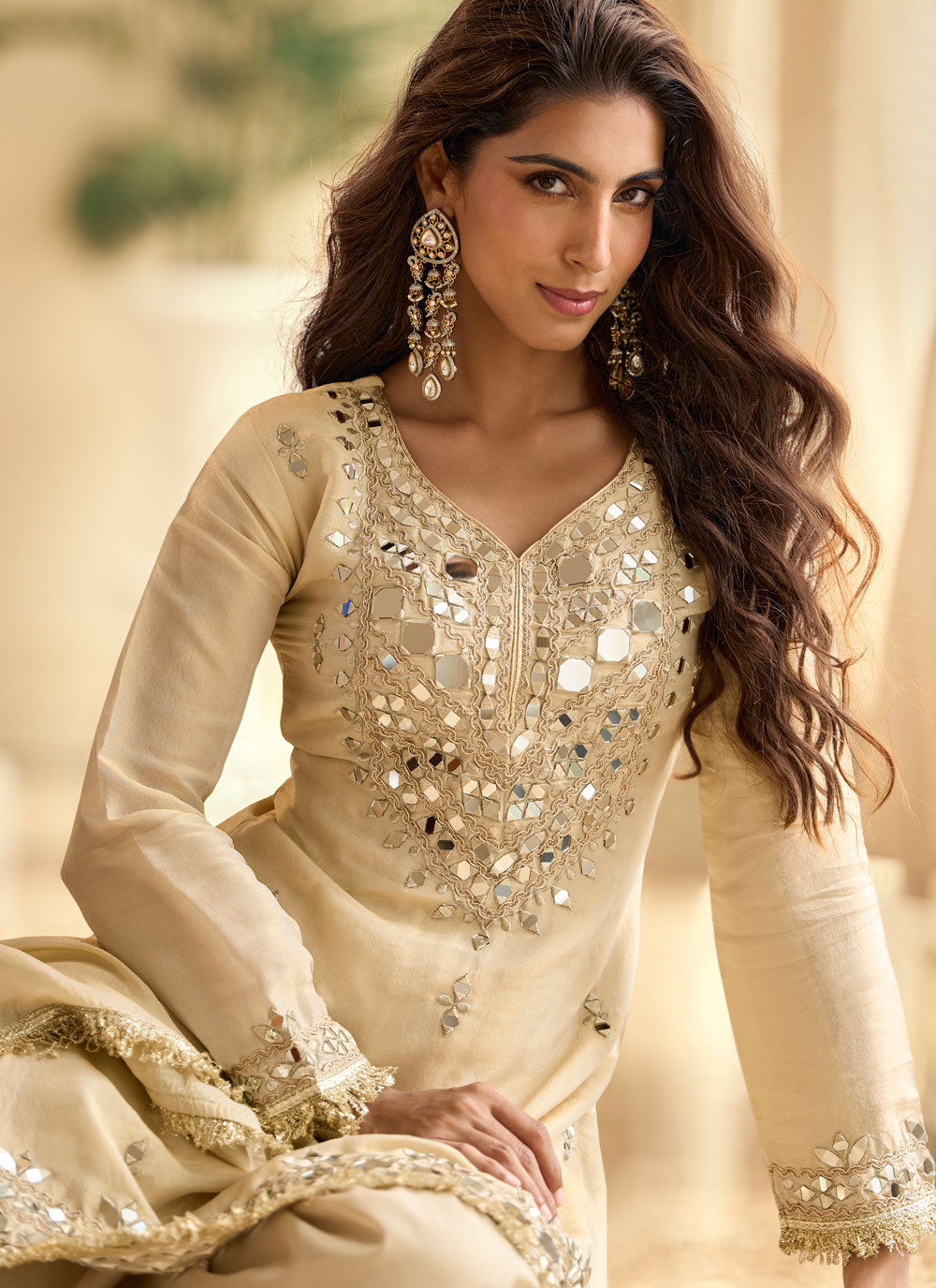 Designed for modern ethnic wear lovers, this Silk Cream Mirror Embroidered Salwar Suit blends traditional detailing with contemporary palazzo styling. Its soft sheen and elegant embroidery make it ideal for parties and family functions. Comes with matching bottom and dupatta.