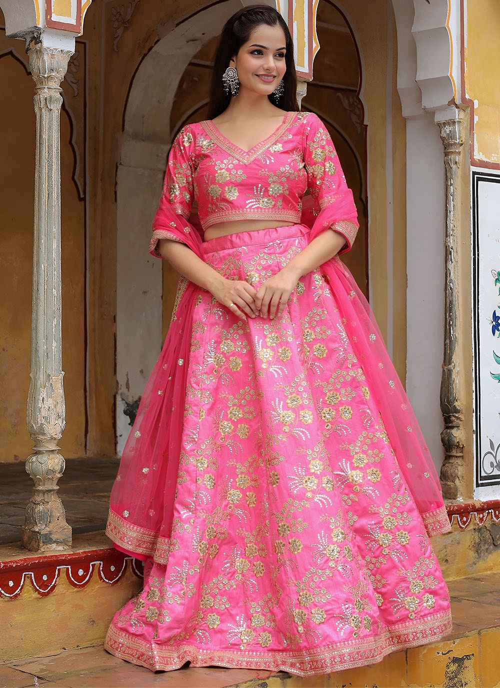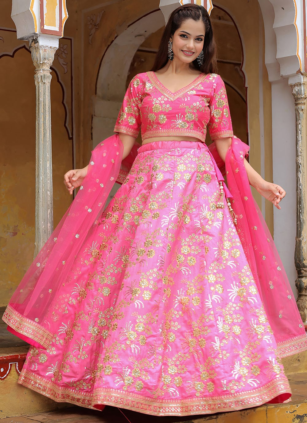 This silk pink lehenga choli is a celebration of timeless beauty. The fine dori embroidery and sequins work add a glamorous shimmer, while the A-line design ensures comfort and grace. Comes with matching choli and dupatta.