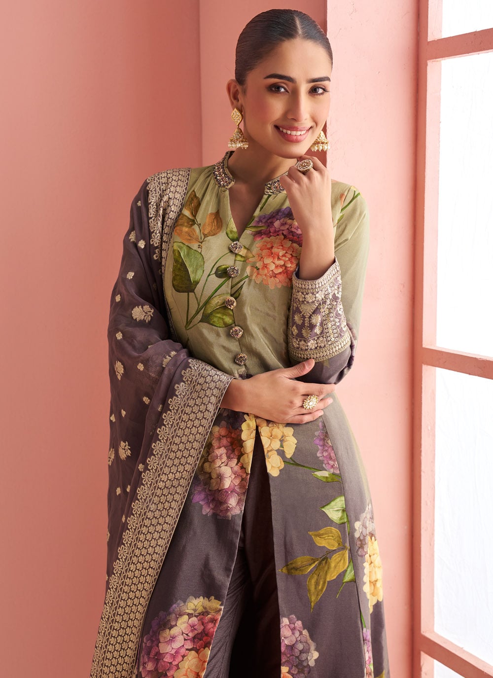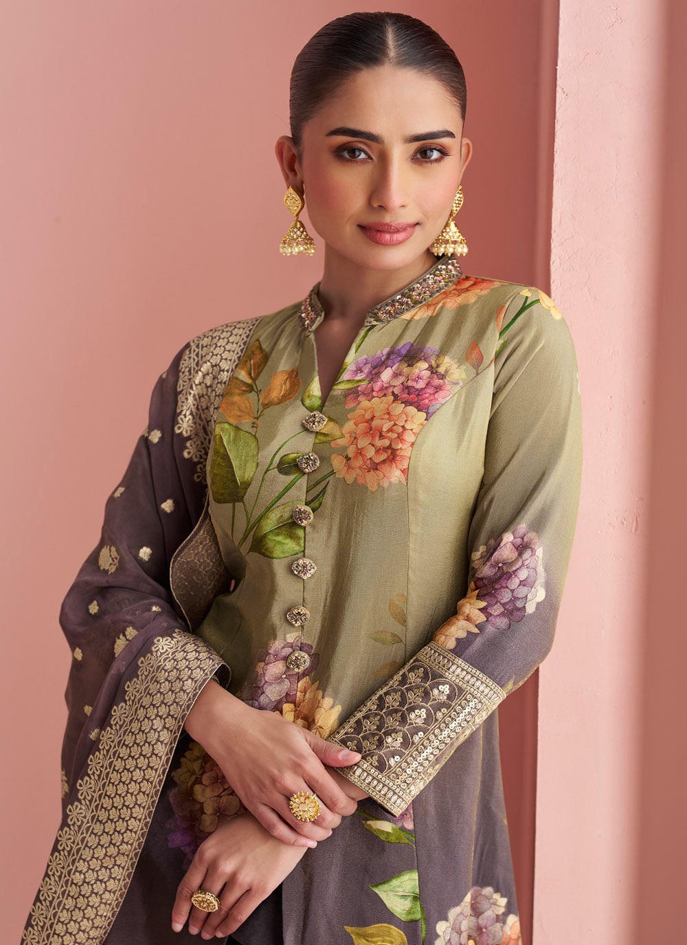 This beige and brown silk salwar suit beautifully blends delicate floral prints with fine embroidery, making it an elegant choice for women who love subtle sophistication. The soft silk fabric enhances comfort, while the earthy tones bring timeless charm. Comes with matching bottom and dupatta.