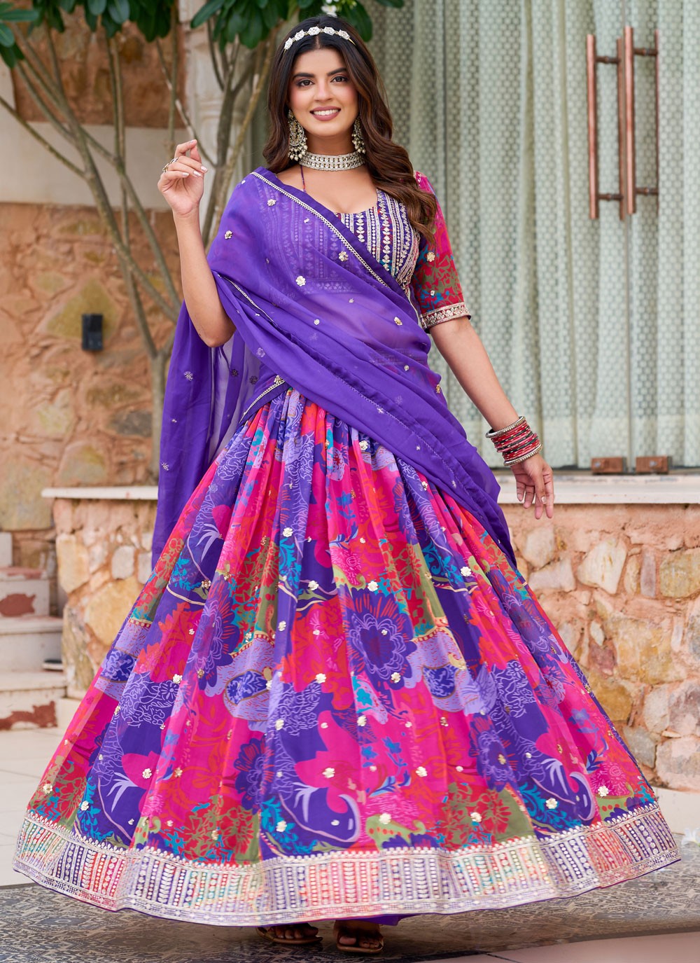 Designed for women who love vibrant and fashionable ethnic wear, this multi-color silk lehenga choli highlights printed artistry and subtle embroidered work. It delivers a chic festive look suitable for weddings and parties. Comes with matching choli and dupatta.