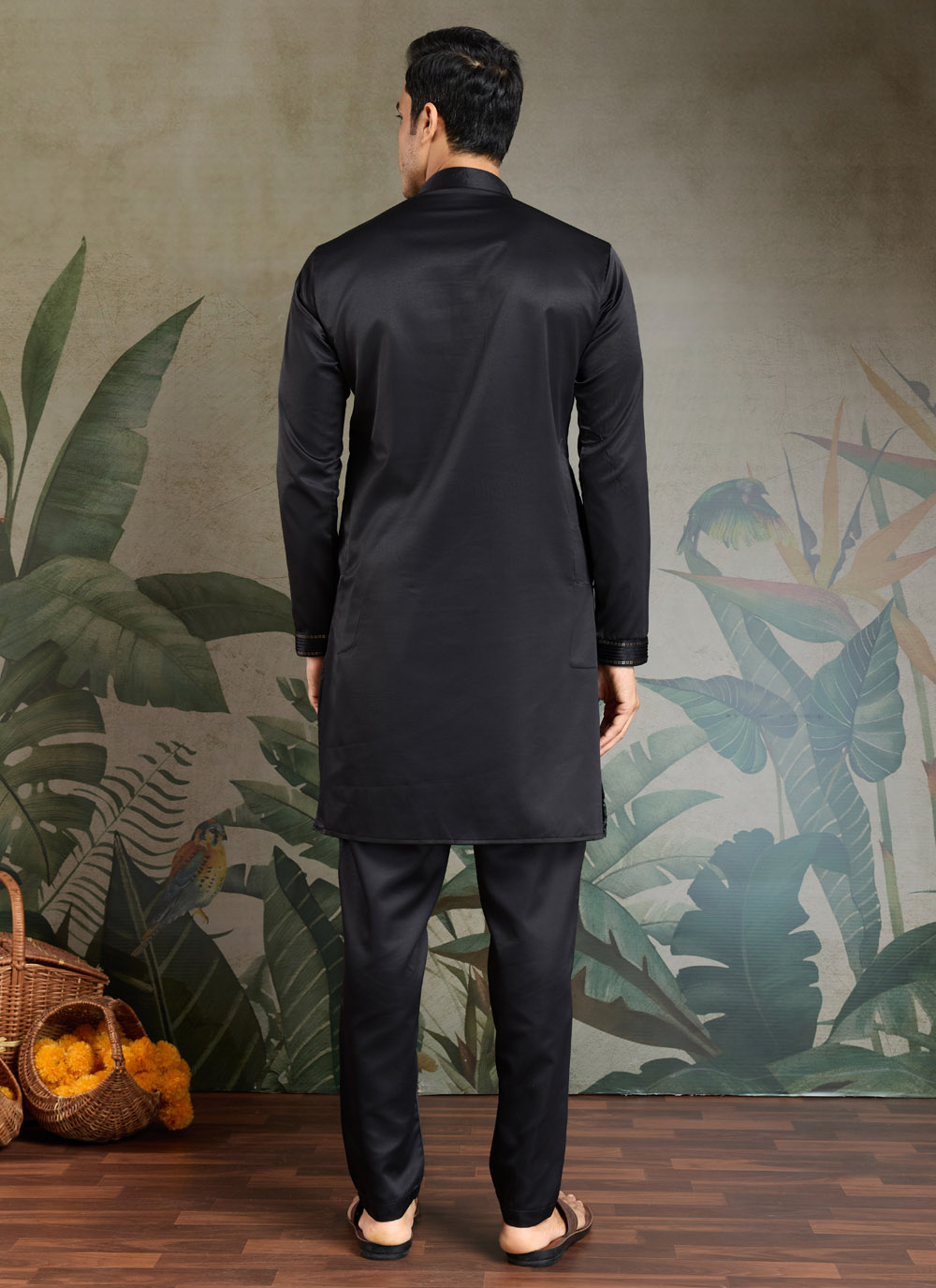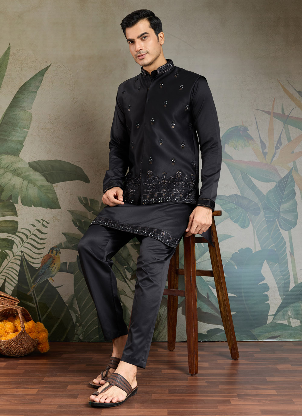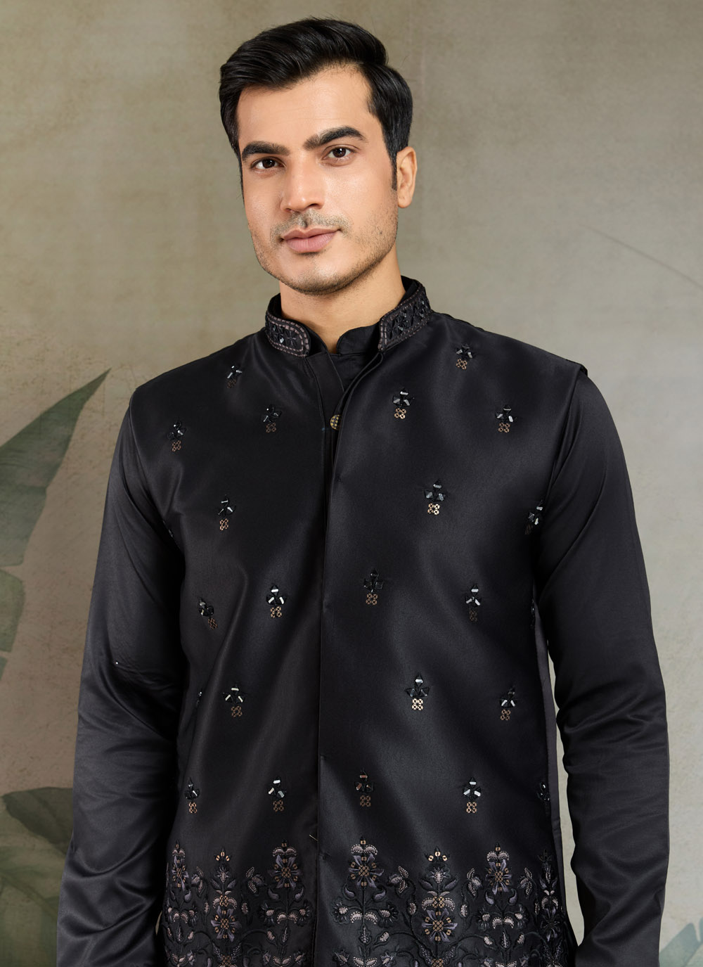 Make a bold ethnic style statement with this embroidered Black Kurta Pajama in silk. The coordinating jacket adds a regal touch, making it a refined choice for cultural events and grand occasions.