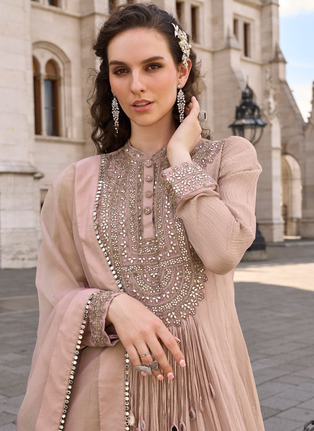 Step into refined elegance with this silk embroidered brown designer gown, crafted to give you a graceful and modern festive look. The smooth silk fabric and tasteful embroidery elevate your style for any celebration.