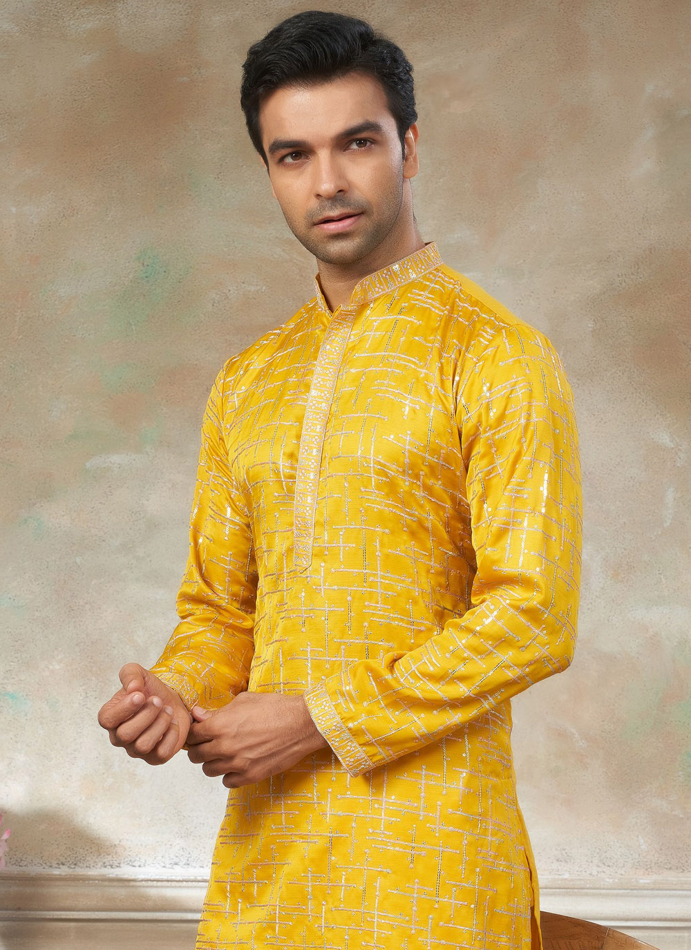The Silk Embroidered Yellow Ceremonial Kurta Pyjama is a perfect choice for men who appreciate traditional elegance with a festive touch. Crafted from premium silk fabric, this kurta offers a smooth texture and rich appearance.