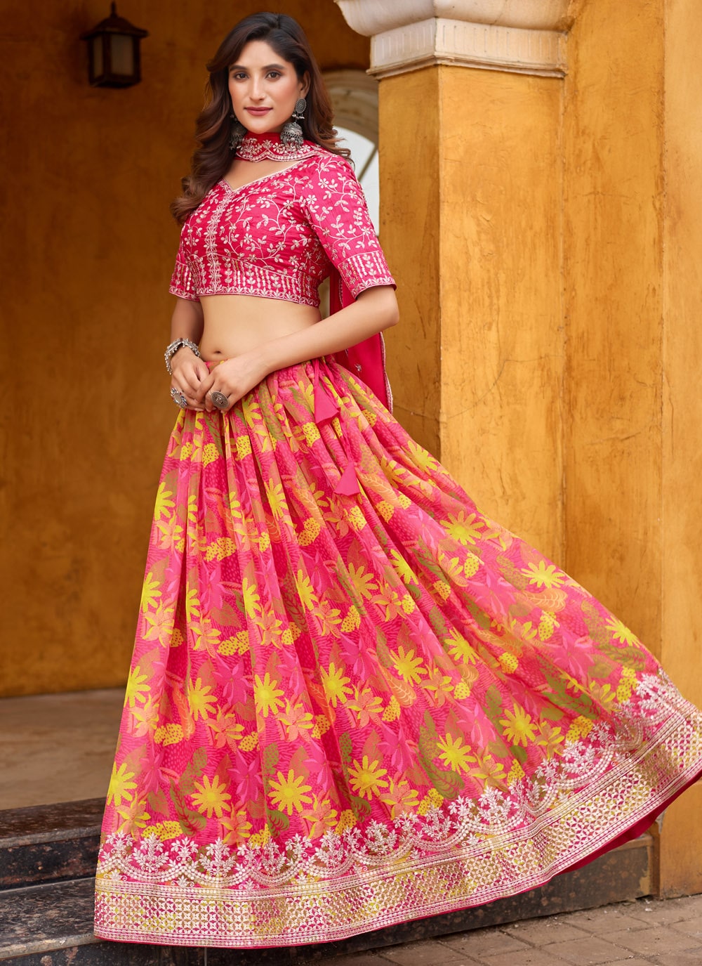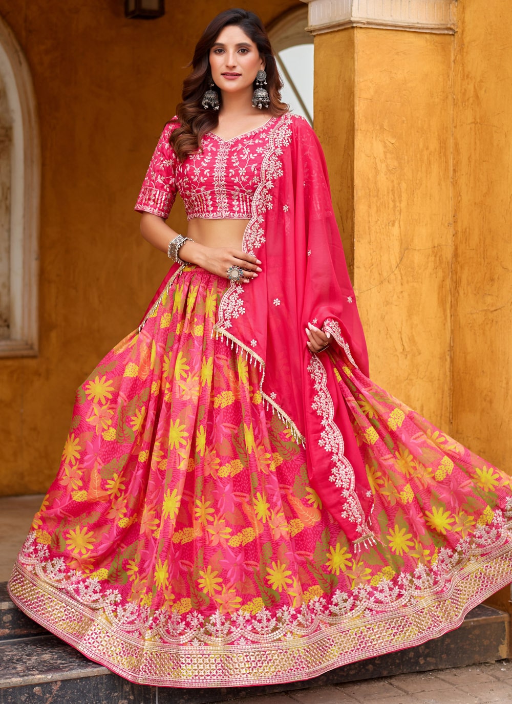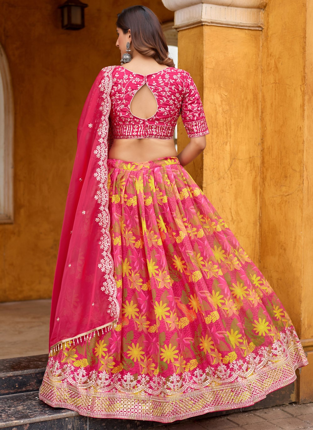Radiate charm with this pink silk lehenga choli, styled with delicate floral prints and highlighted with sequins and zari embroidery. A perfect blend of grace and glamour. Comes with matching choli and dupatta.
