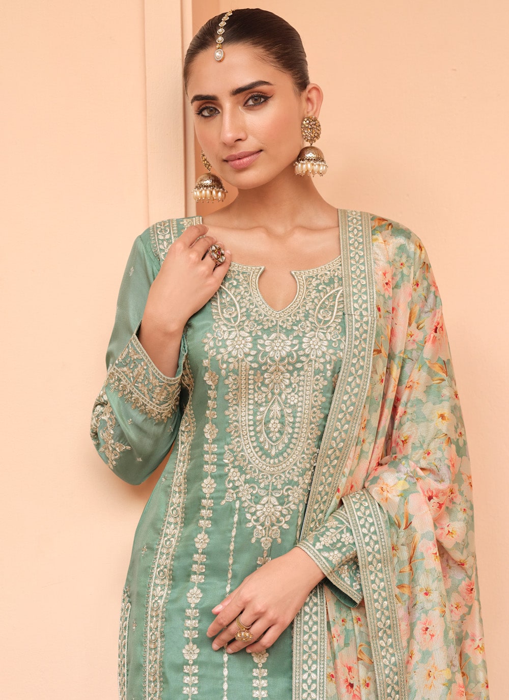 Elevate your ethnic wardrobe with this silk green palazzo salwar suit, beautifully adorned with delicate embroidered work. The smooth silk fabric offers a luxurious touch, while the soft green shade adds a refreshing elegance ideal for festive and family occasions. Comes with matching bottom and dupatta.