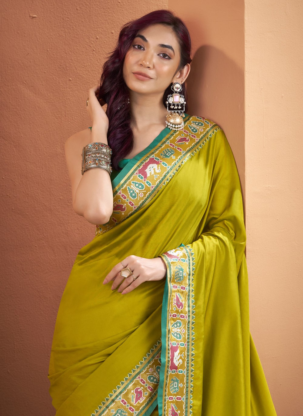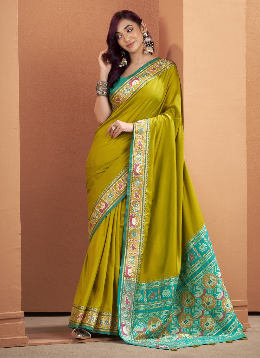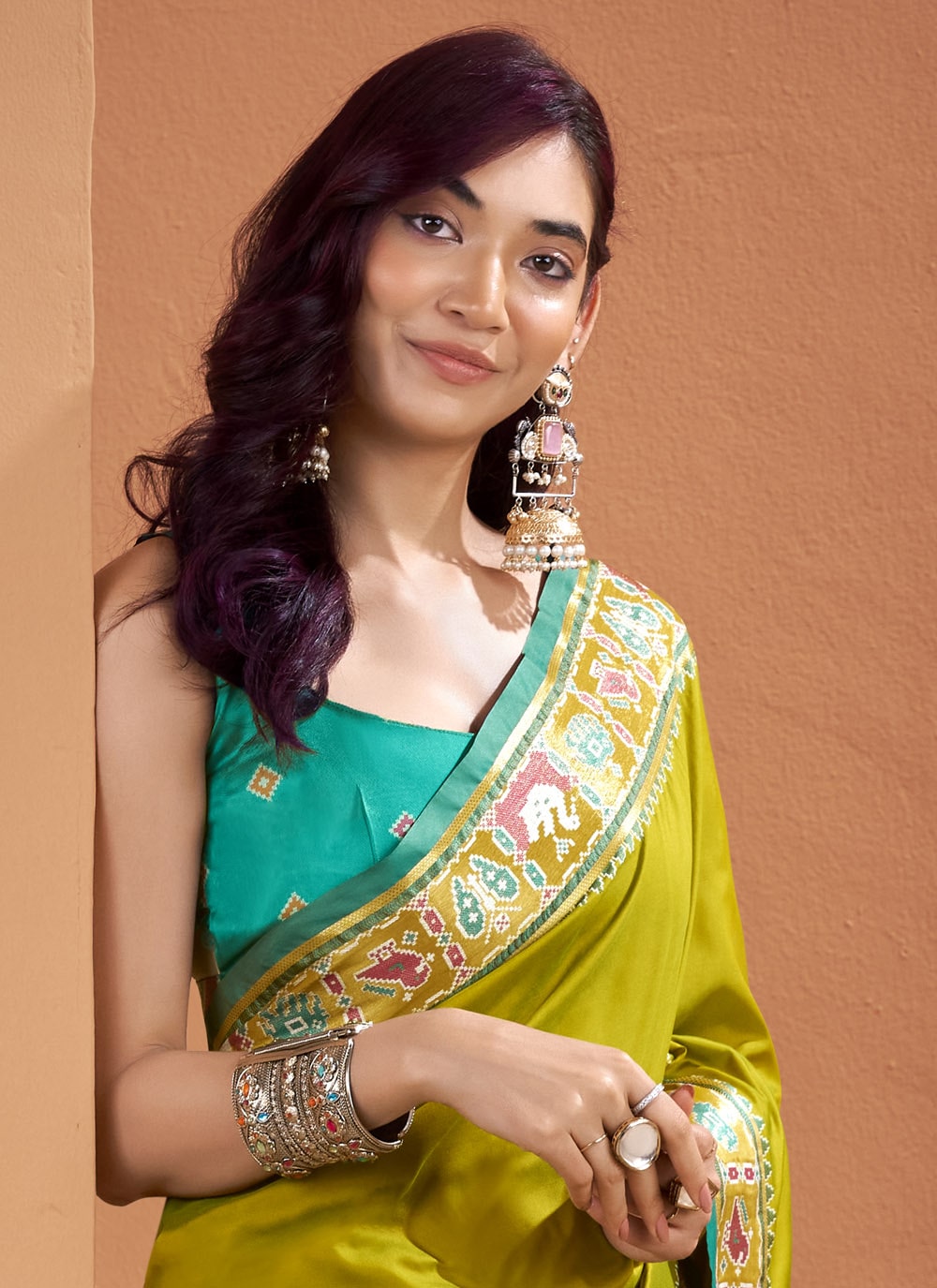 Celebrate your special moments in this graceful Silk Green Patola Saree, meticulously woven with traditional patterns that reflect India’s rich textile heritage. The vibrant green silk fabric drapes flawlessly. Comes with matching blouse.