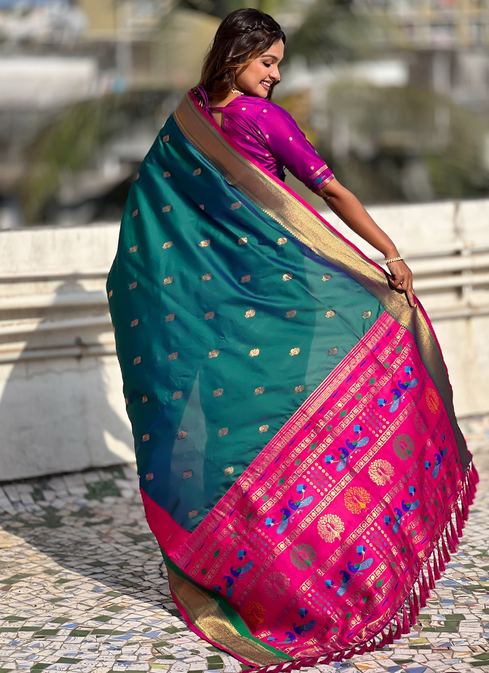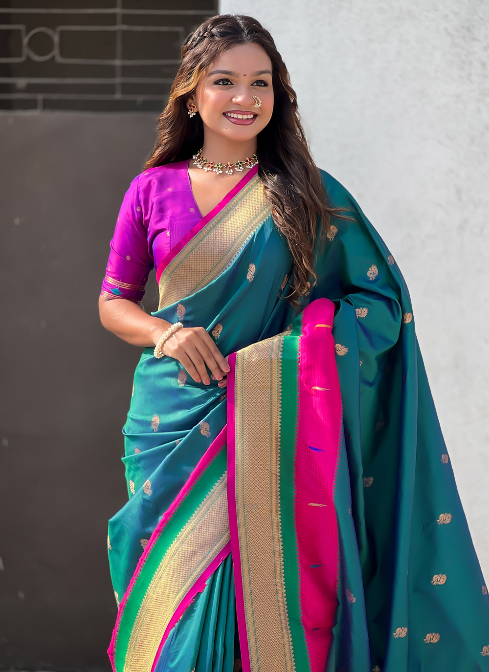 Drape yourself in classic elegance with this Silk Green Zari Woven Traditional Saree. The rich green hue paired with intricate golden zari weaving brings out a look that’s regal, graceful, and ideal for festive celebrations and religious ceremonies. Comes with matching blouse.